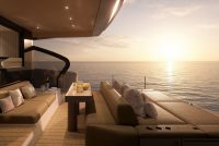 A surprisingly spacious and versatile stern area introduces the new concept of the Fun Island, an unprecedented open-air lounge au fil de l’eau, designed to experience the large spaces in total freedom and comfort. The entire Main Deck is transformed into a large space that offers the possibility of interacting with everyone, even with those in the water, breaking down the last physical and social barrier. It is the real and symbolic space of «fun». The Fun Island is completed by two opening wings and an aft platform that reveals a large staircase that descents into the water.