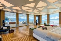 Luminosity embraces art in an extraordinary way. Beauty in its purest form blends with comfort and onboard needs. Every single detail tells a story. Every creation evokes masterpieces of artists who have left a mark on the history of art. Damien Hirst’s famous coloured circles find new expression on the French limestone floor in the Main Deck Lobby. As for Man Ray, an extraordinary eye-shaped construction at the base of the 18-meter-high stairwell winks at his magnificent work. The hymn to life of Matisse’s collages inspires the intriguing shapes throughout the yacht’s Main Saloon and Lounge. Among them, a sinuous configuration of hand-forged steel polished to a mirror that encloses a thousand Bohemian crystal bulbs illuminates the main lounge.