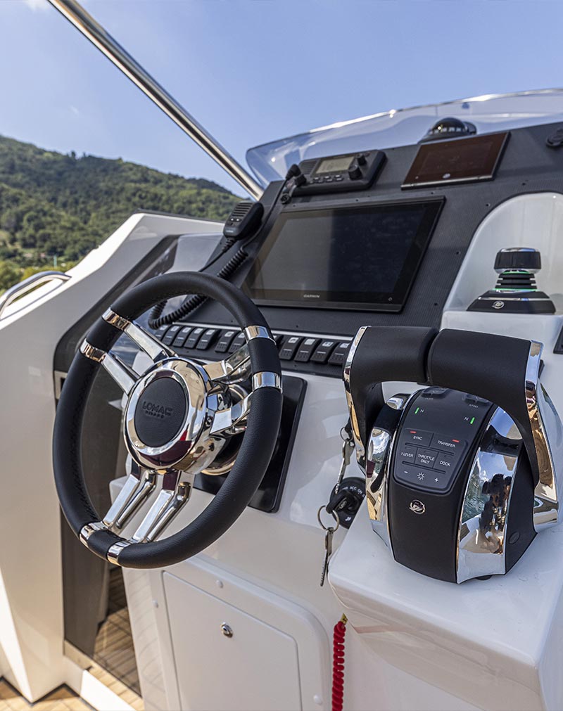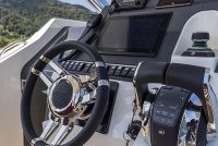 - double hydraulic steering system, with 2 cylinder, inox wheel with hand-sewn sky, compass and horn