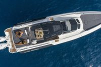 - black micro-perforated bimini with 6 carbon poles (from pilot seat to stern sundeck)