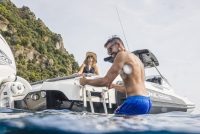 - back platform in teak, hidden inox ladder, fixed stainless handles to go back, 3 towing rings and belts, 4 mooring cleats
