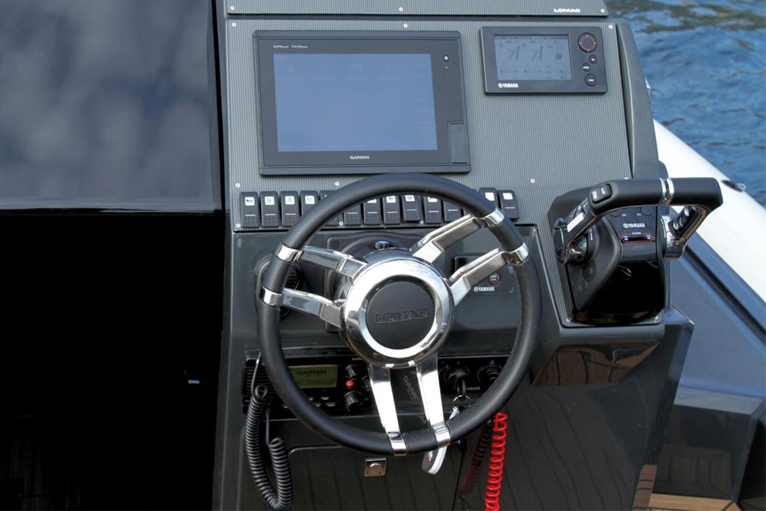 - hydraulic steering system, inox wheel with hand-sewn sky, compass and horn