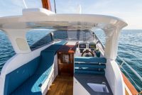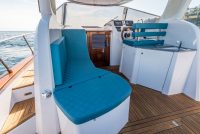 This beautiful and charming gozzo is the first of the series with an HT (hardtop) and its innovative design does not go unnoticed. The strength of Libeccio 11 is the internal division of the hull. In fact, it has 2 separate cabins, a double cabin and another one in the dinette, which, thanks to a retractable bulkhead system, becomes a second double bedroom.
