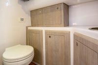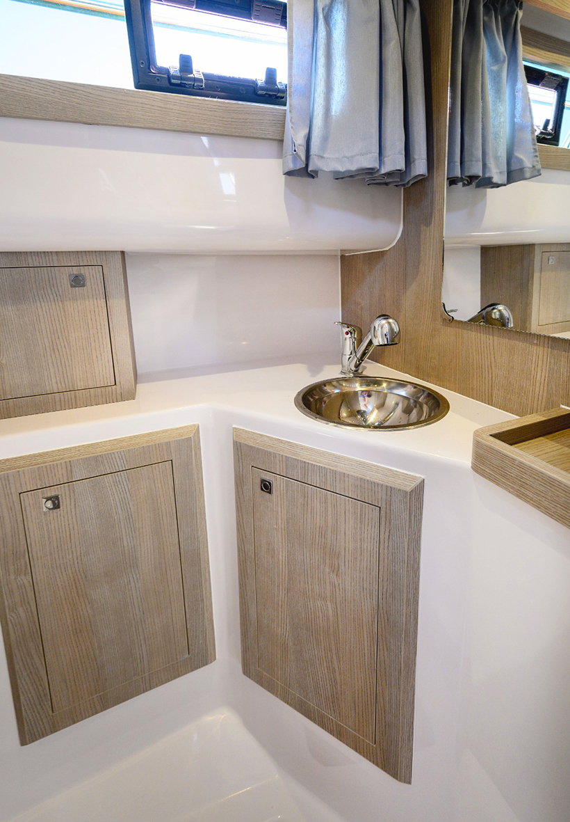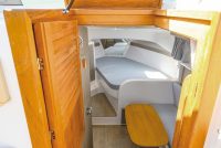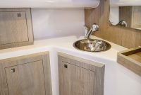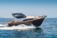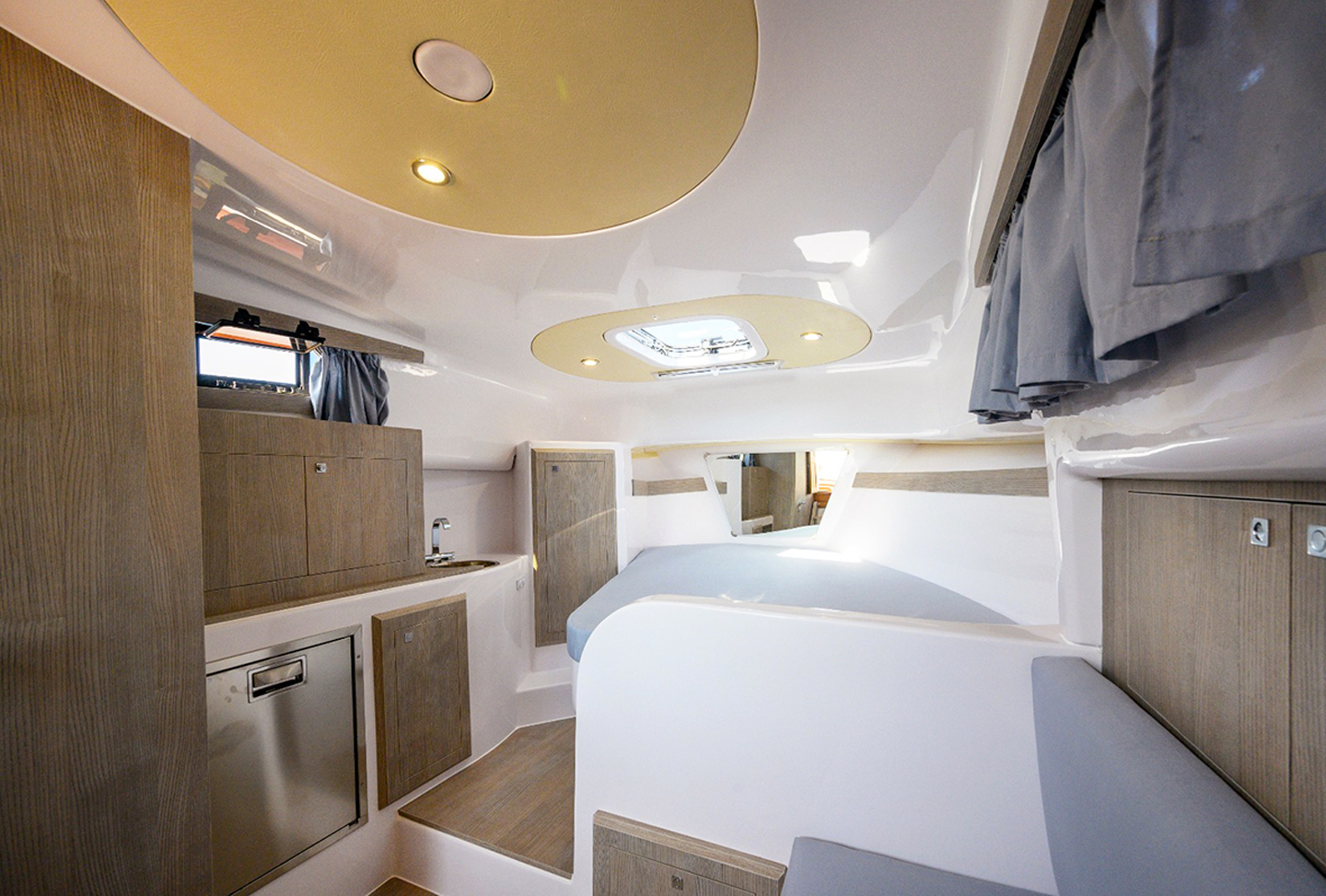Libeccio 9.0 is the first cabin cruiser of the range with a transformable dinette, so as to have 4 beds, including those of the spacious double cabin. The indoor kitchen is equipped with a sink, a hob and a fridge.