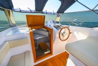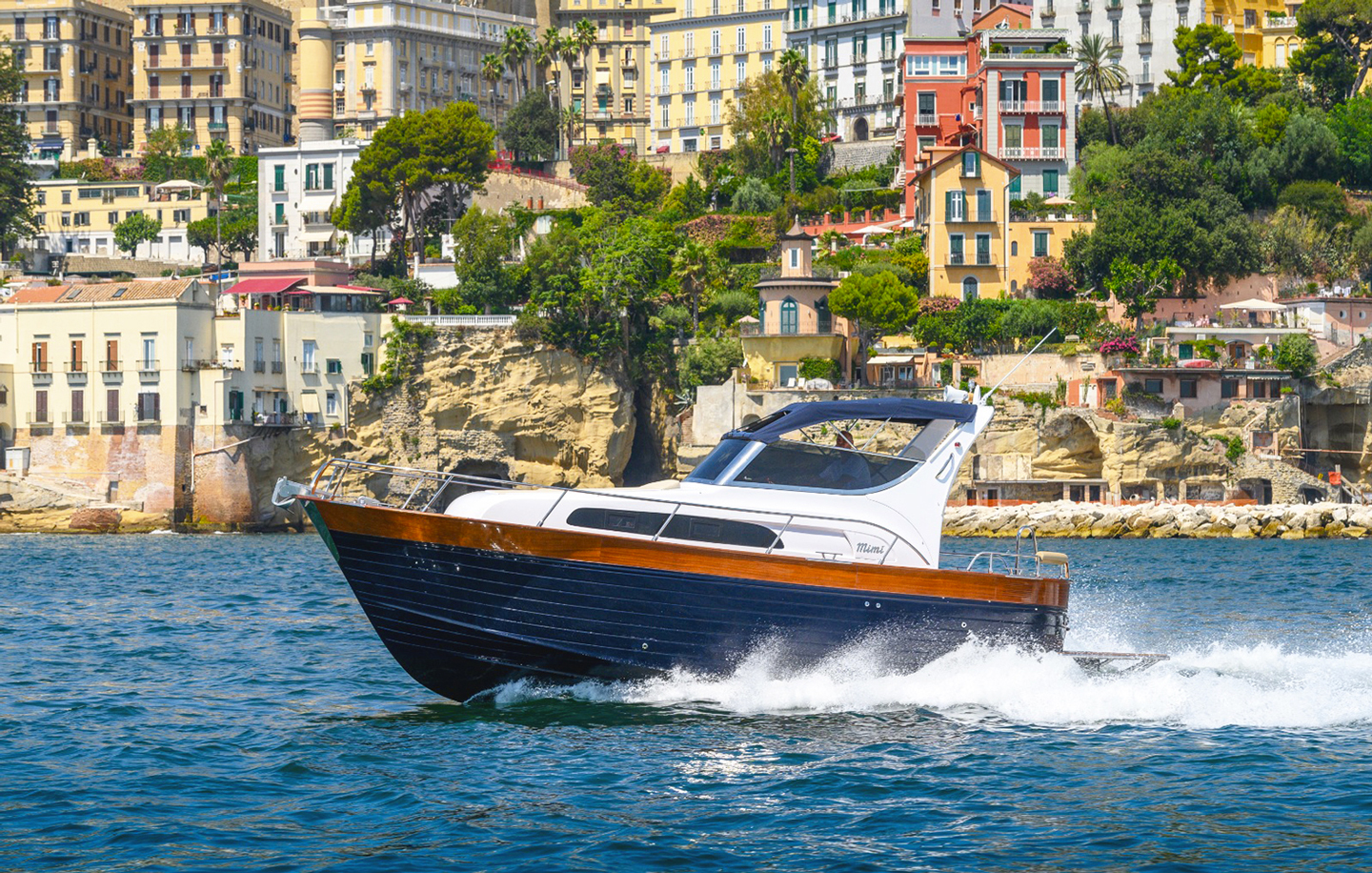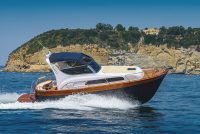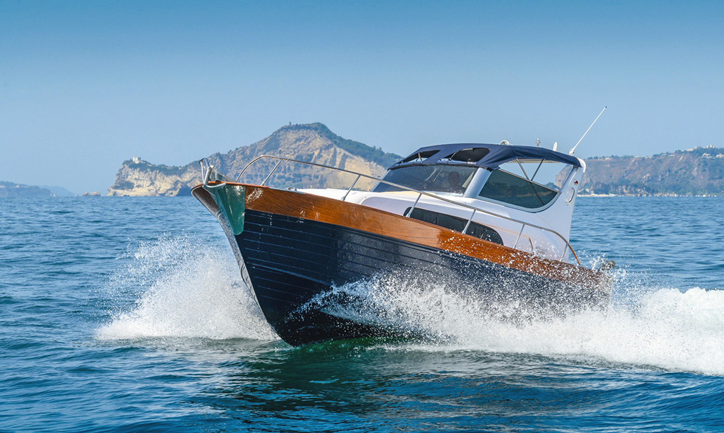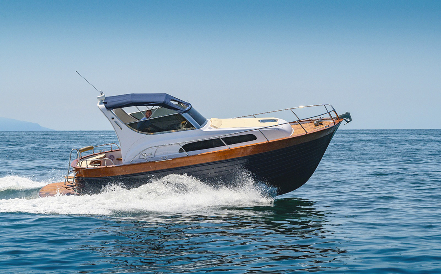 The deck is made of valuable old teak wood. Like all Gozzi by Mimì, the hull is made with vacuum infusion to reduce its weight for a more solid product with less impact on the environment, since it allows the use of a less powerful engine.