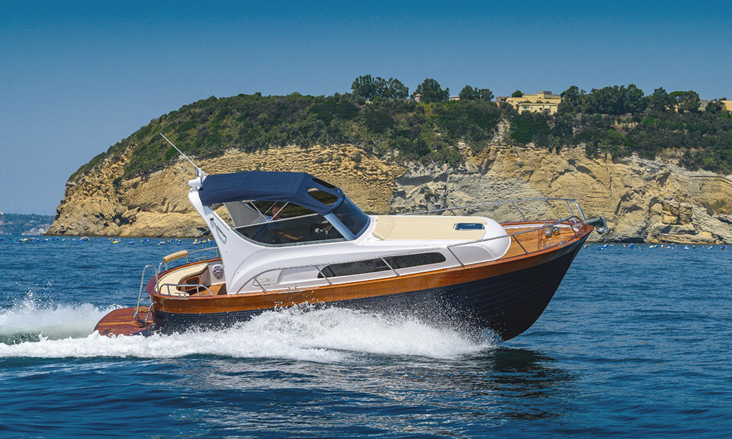 Like other models, this elegant gozzo has a fiberglass roll bar which allows the awning to cover the entire stern of the boat.