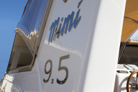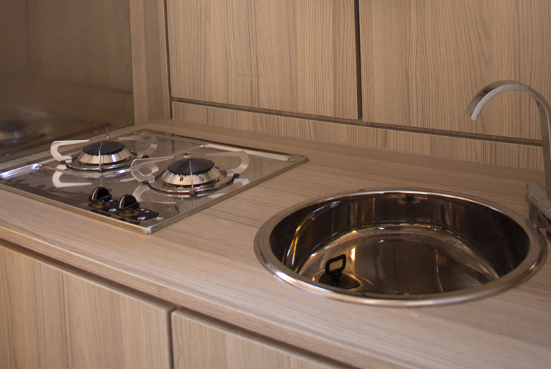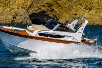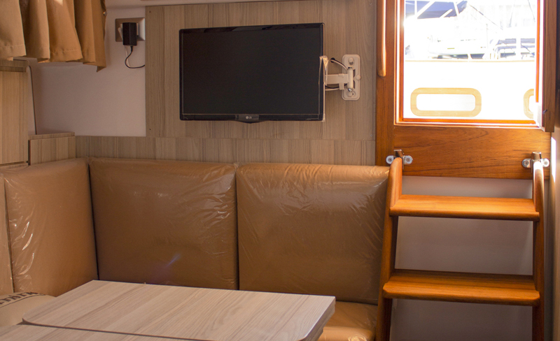 Libeccio 9.5 is also a cabin cruiser with a transformable dinette, so as to have 4 beds, including those of the spacious double cabin. The indoor kitchen is equipped with a sink, a hob and a fridge.