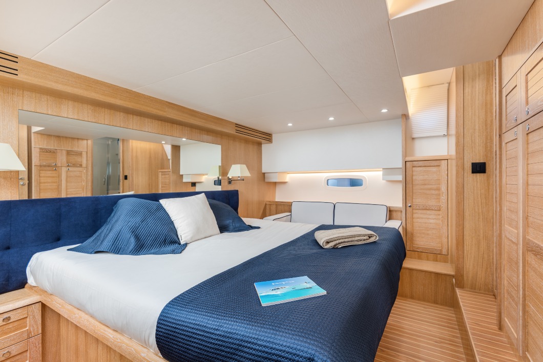 The Menorquín 54 Hard Top boasts an impressive internal volume and elegant living space, with flexible accommodations options.