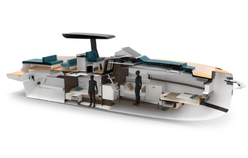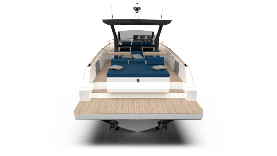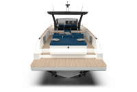 Featuring a double access to the cockpit, its 60 cm long aft platform can be extended up to 120 cm. The electro-hydraulic transforming bathing platform allows easy access to the water for leisure activities, connecting life on board with the sea.