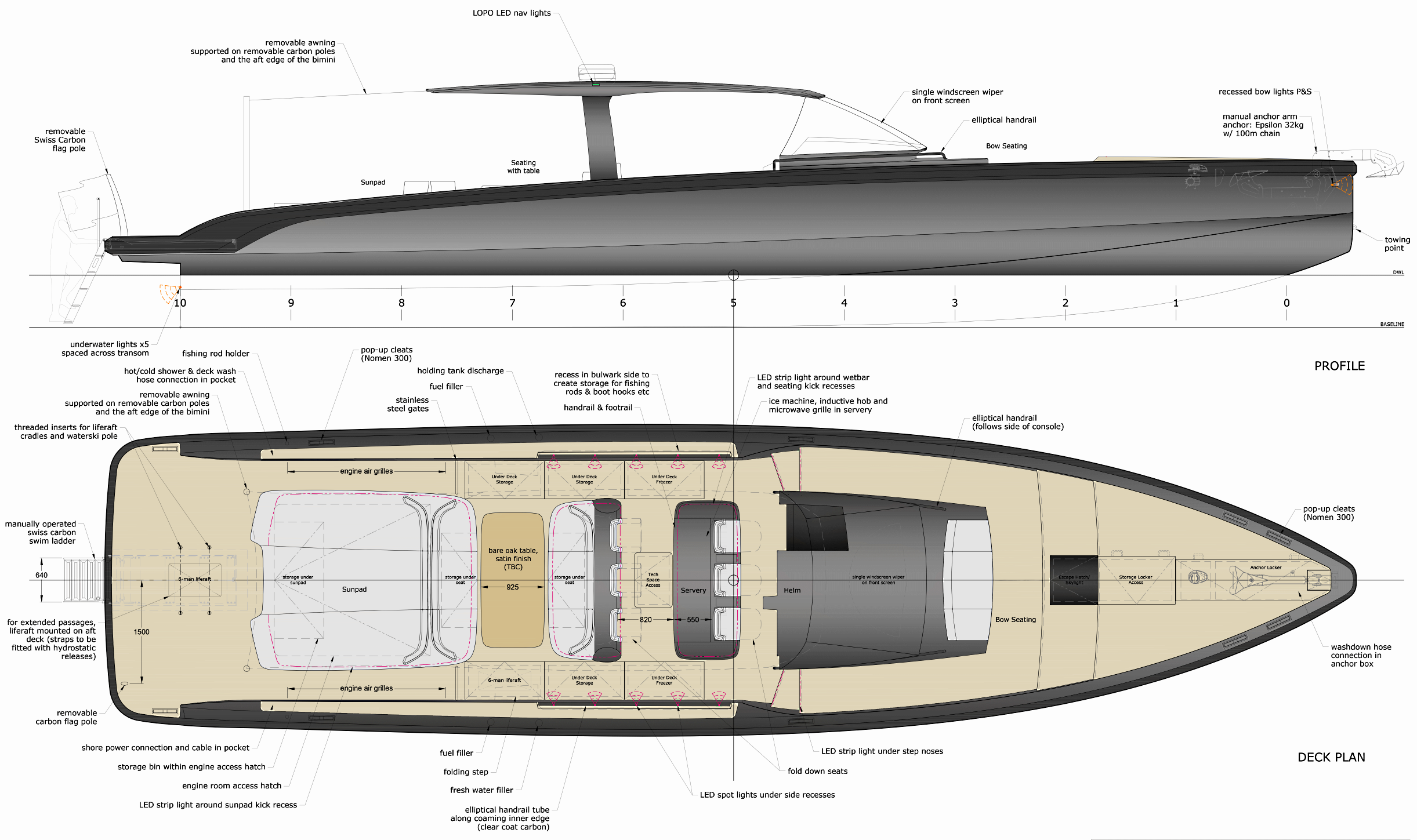 Cape Horn Engineering comments “We conducted a rigorous testing procedure to evaluate and assess the boat’s performance in varying sea states. One of the main concerns of the client was the amount of spray that the yacht would experience when going through waves at speed. CFD investigations and analyses were conducted on how to minimise the spray or prevent spray being blown back into the boat. By optimising the design of the freeboard with a generous flare to the bow and giving special attention to the position of the multiple chines and spray rails this concern was addressed, keeping the boat as dry as possible’’.