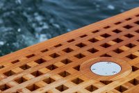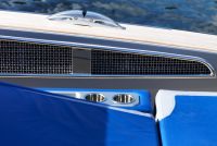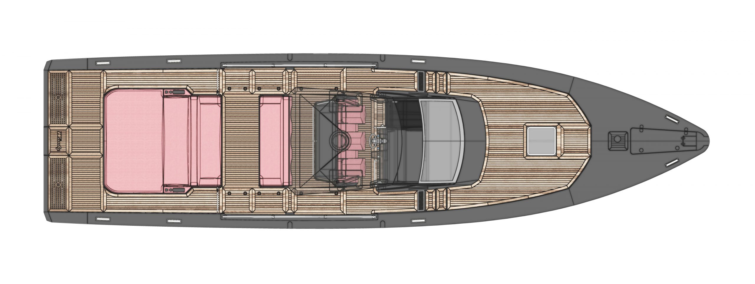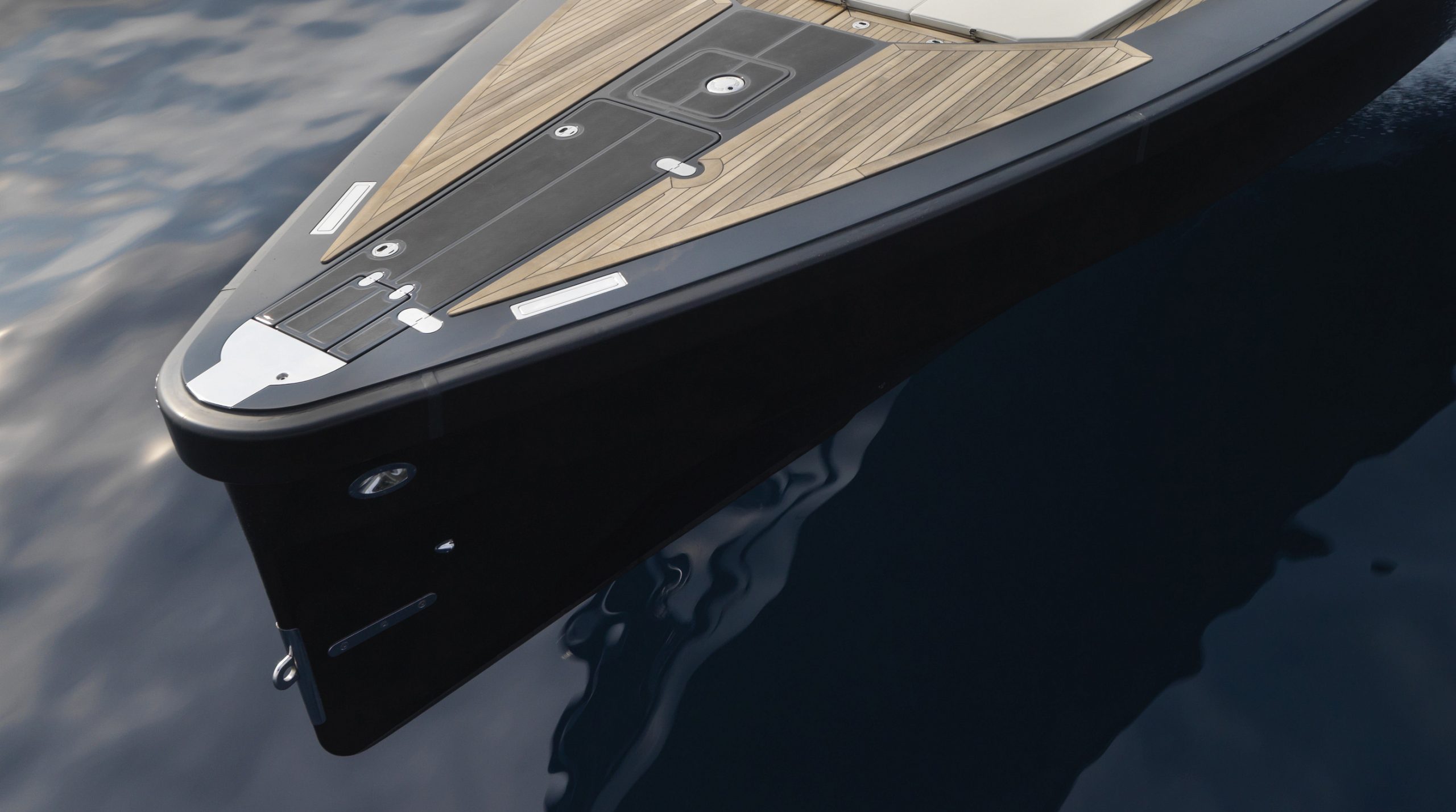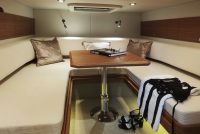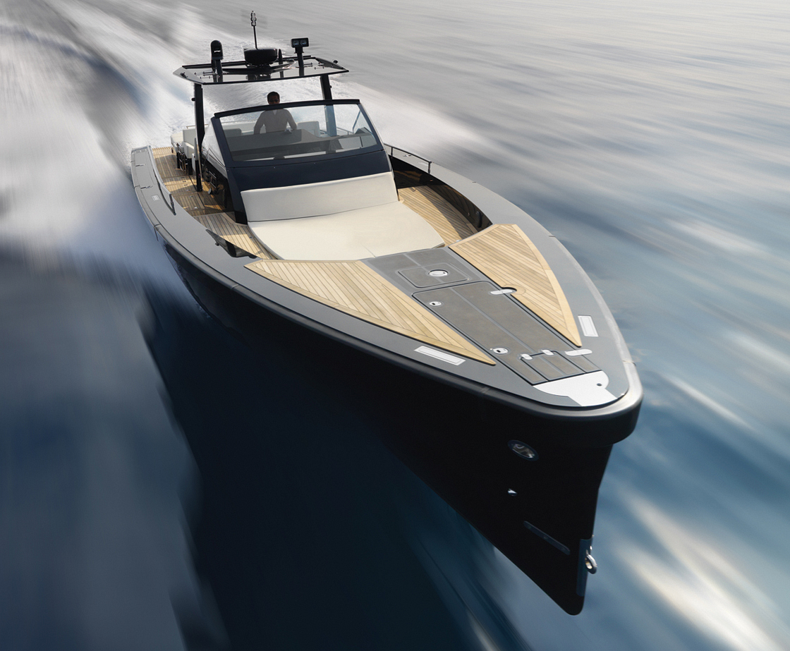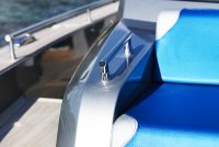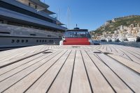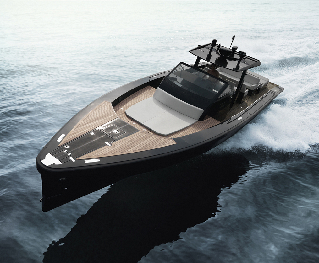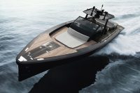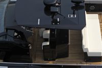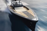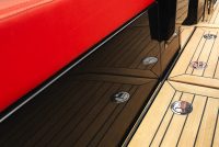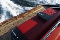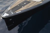 A spacious cockpit features three separate racing seats at the helm and three standing sport seats under the shade of the bimini. The teak deck provides open walkaround access from the raised foredeck to the additional seating, sun lounger and hydraulic bathing ladder aft – perfect for race spectating, swimming or picnicking at anchorage. A head with shower is located below decks, along with a double berth. Truly, a superyacht among tenders.