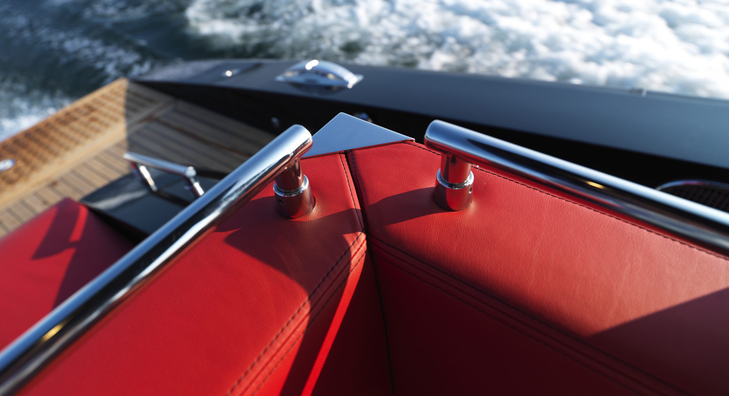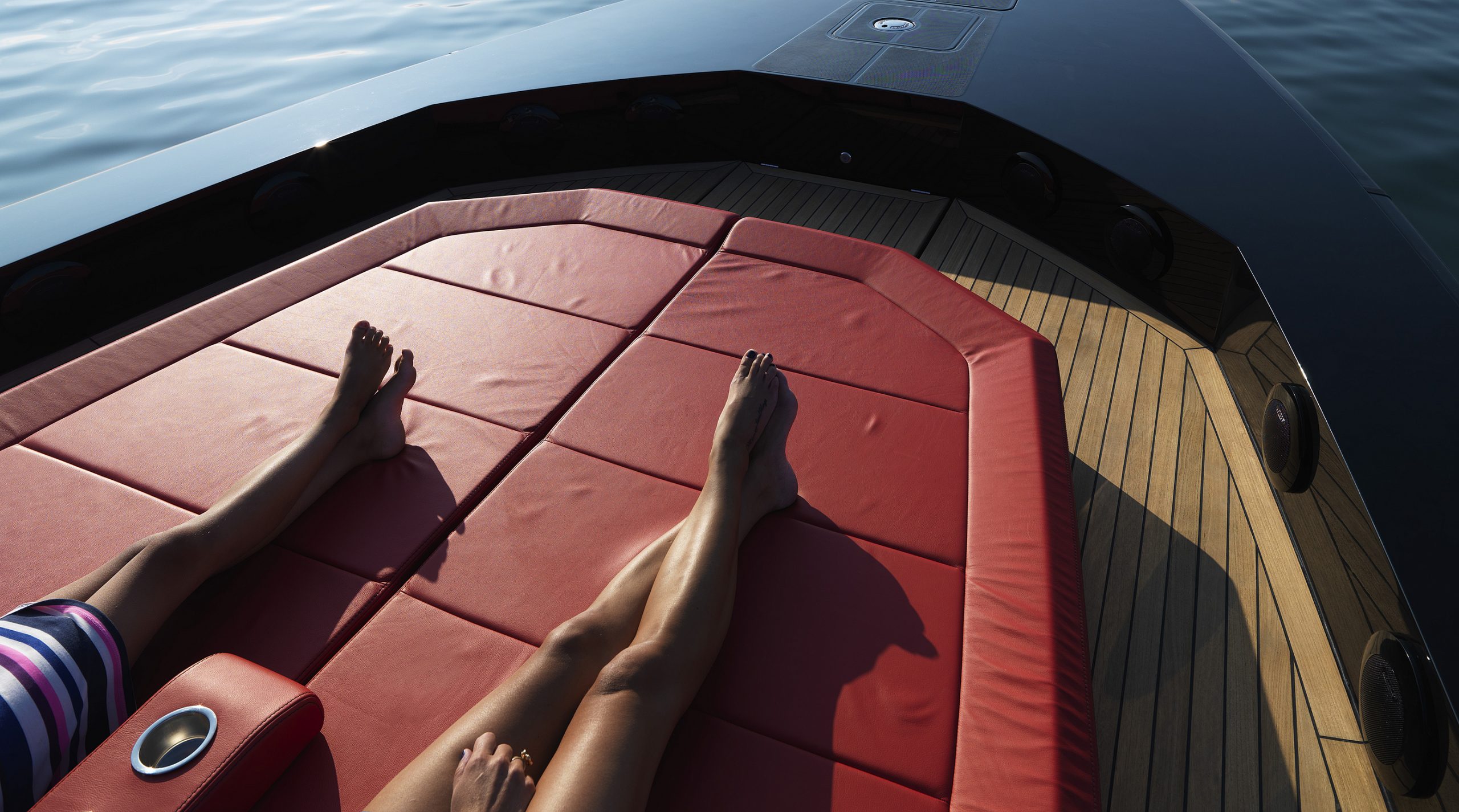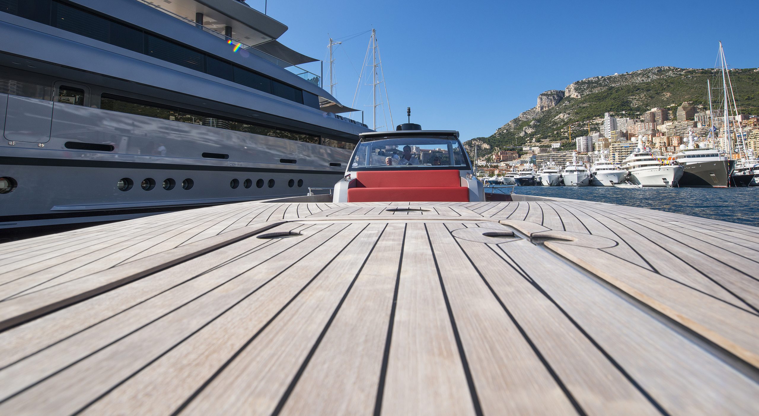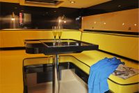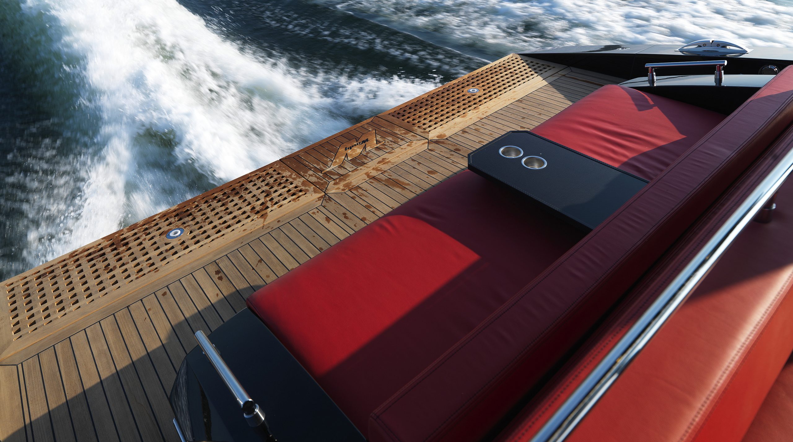 A spacious cockpit features three separate racing seats at the helm and three standing sport seats under the shade of the bimini. The teak deck provides open walkaround access from the raised foredeck to the additional seating, sun lounger and hydraulic bathing ladder aft – perfect for race spectating, swimming or picnicking at anchorage. A head with shower is located below decks, along with a double berth. Truly, a superyacht among tenders.