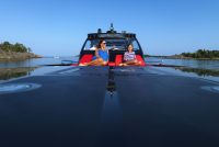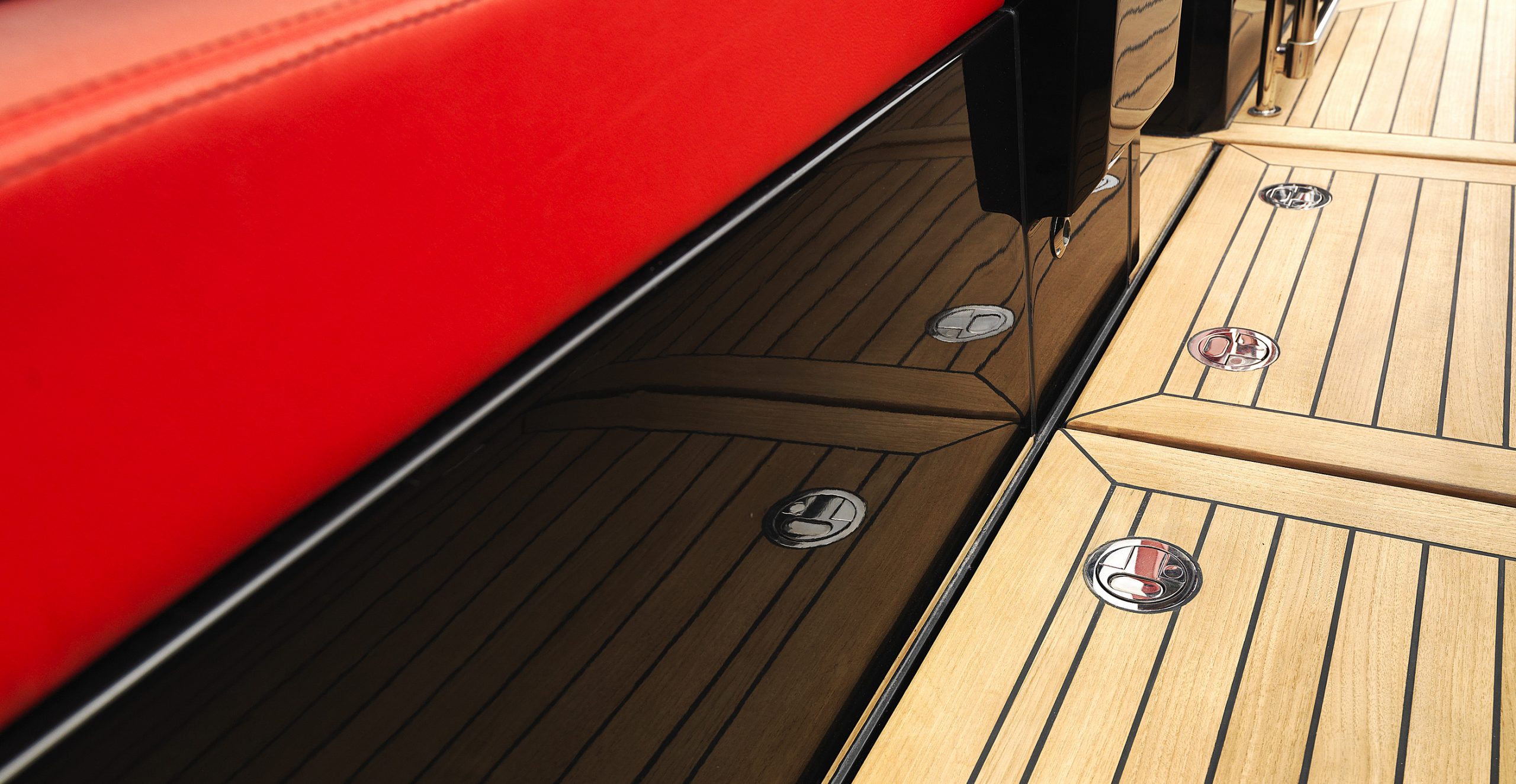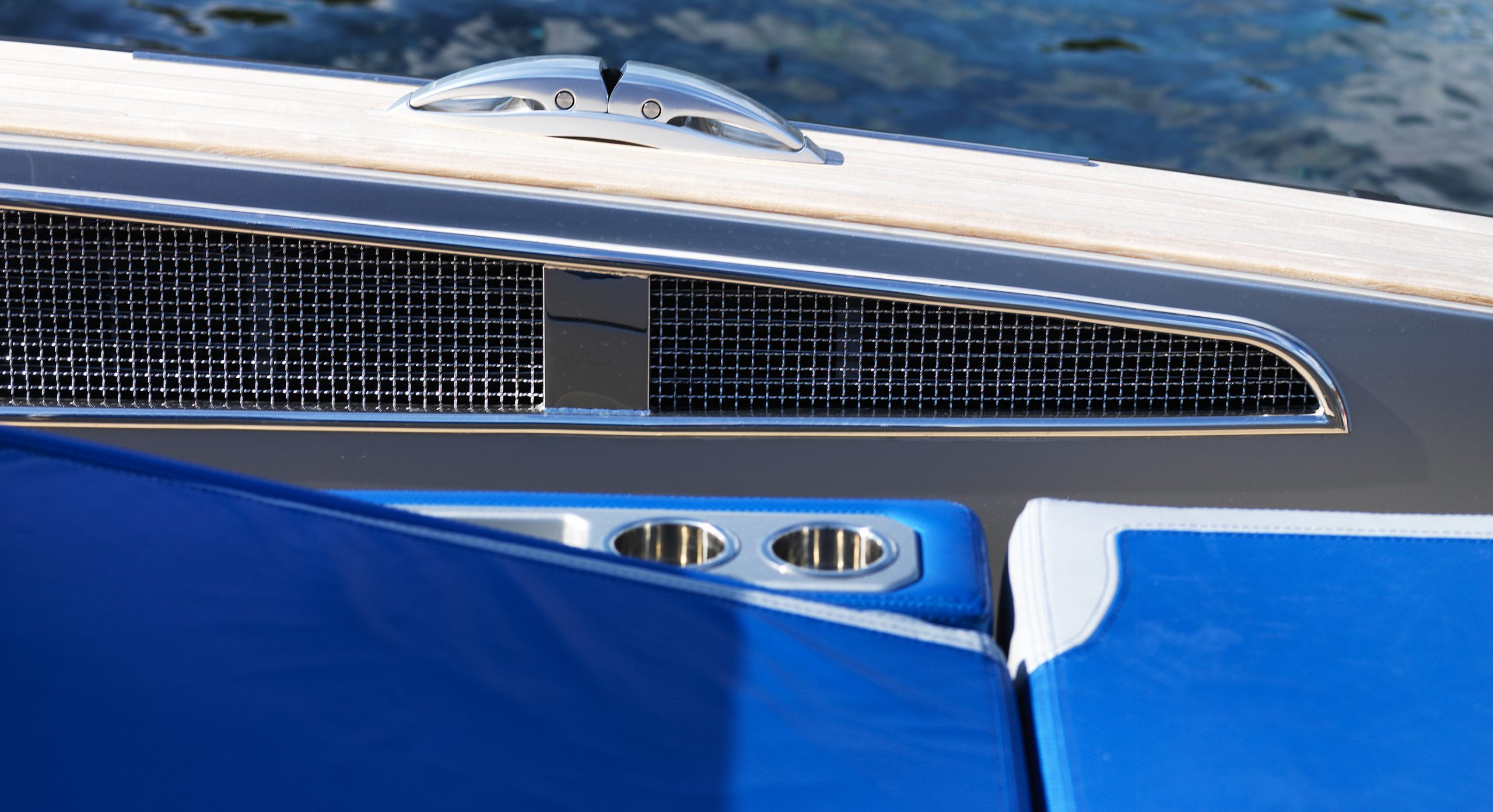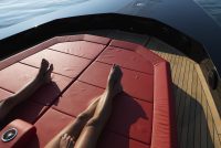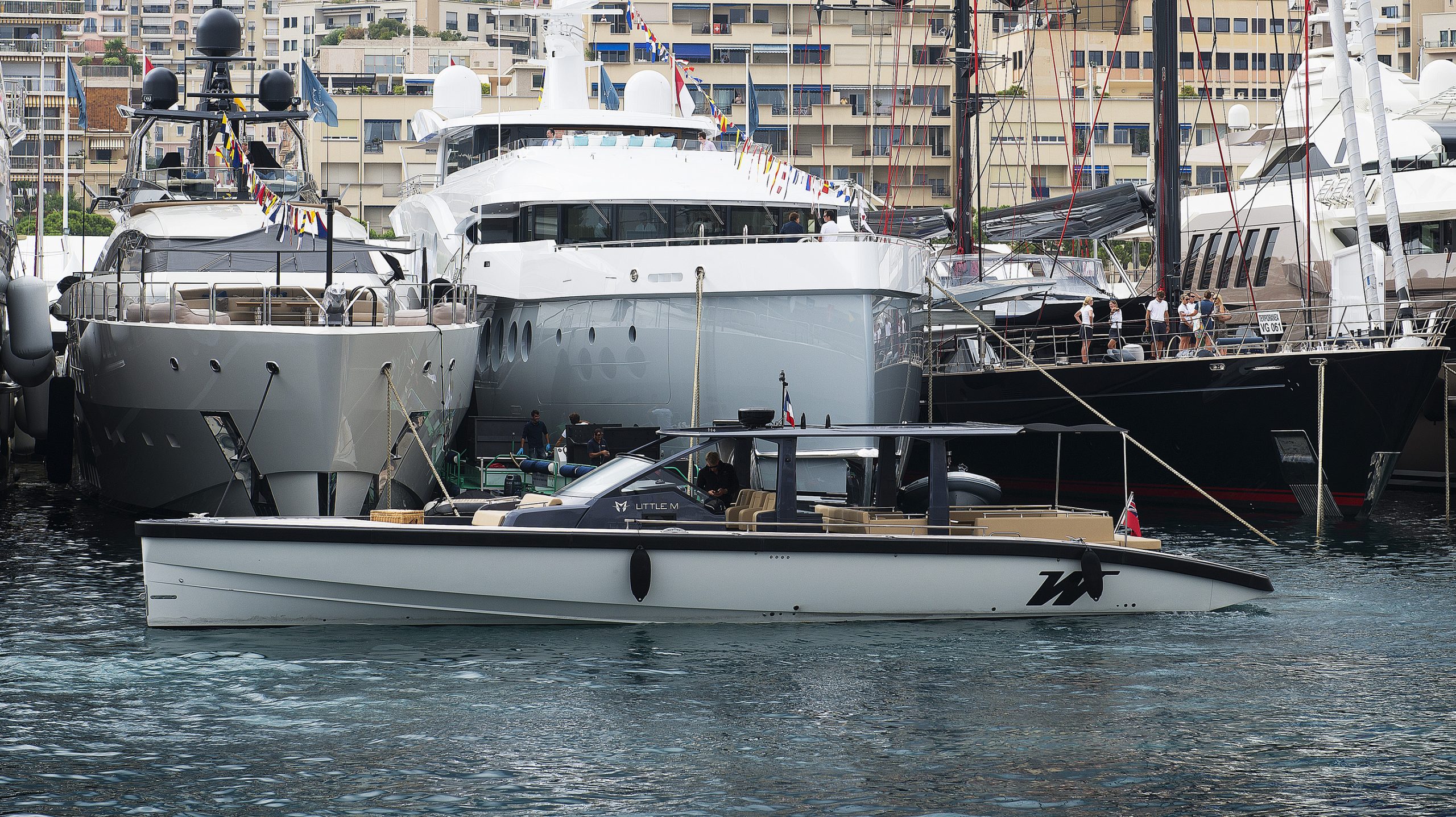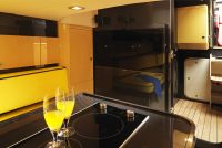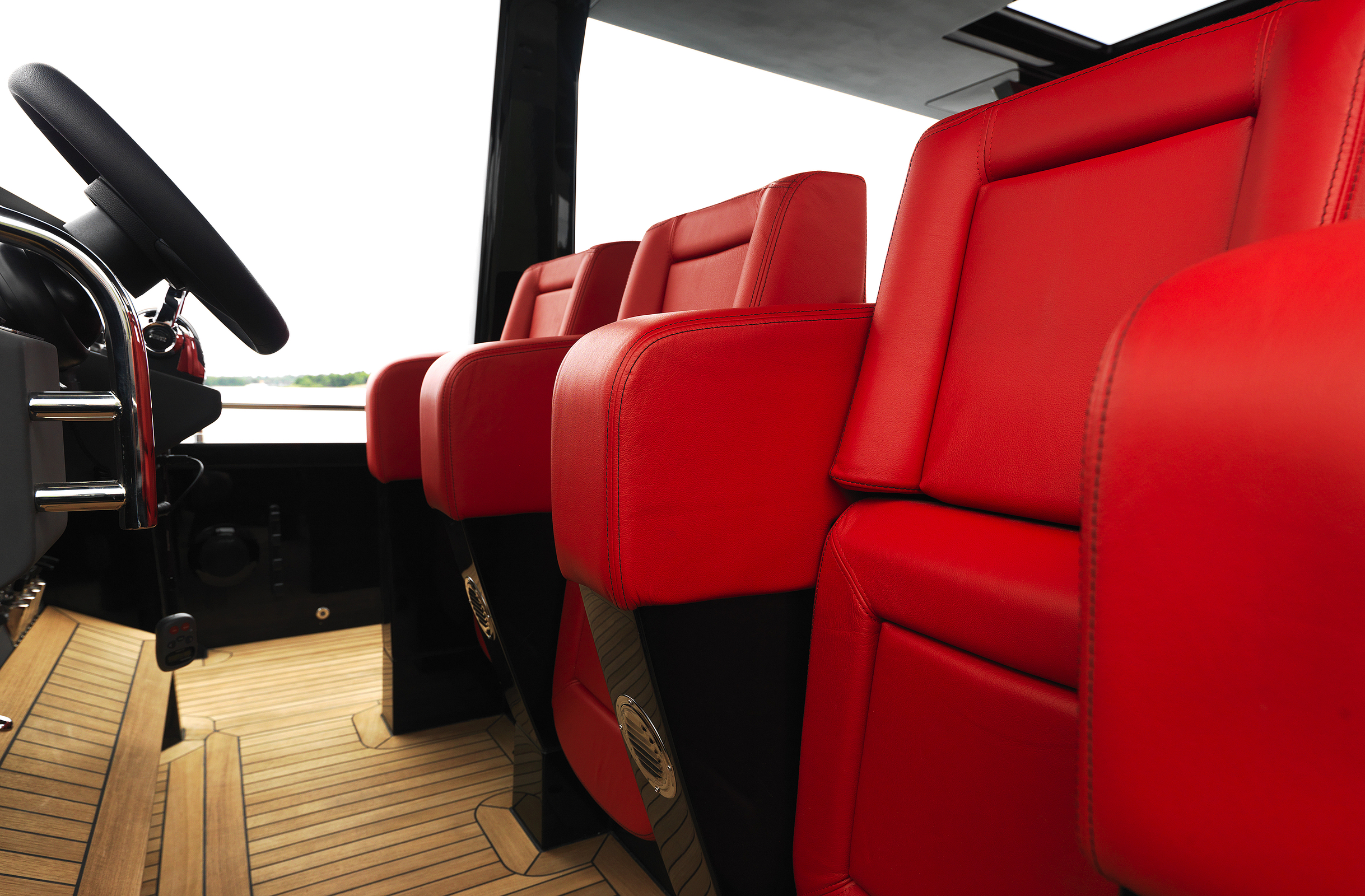 A spacious cockpit features three separate racing seats at the helm and three standing sport seats under the shade of the bimini. The teak deck provides open walkaround access from the raised foredeck to the additional seating, sun lounger and hydraulic bathing ladder aft – perfect for race spectating, swimming or picnicking at anchorage. A head with shower is located below decks, along with a double berth. Truly, a superyacht among tenders.