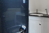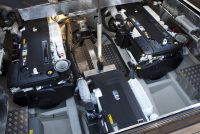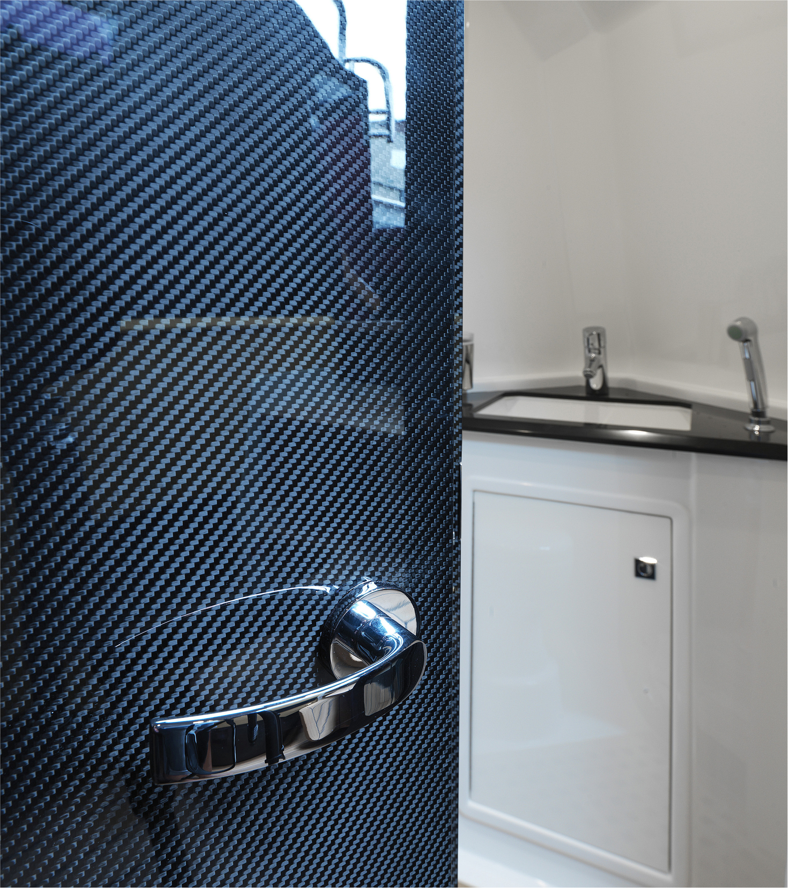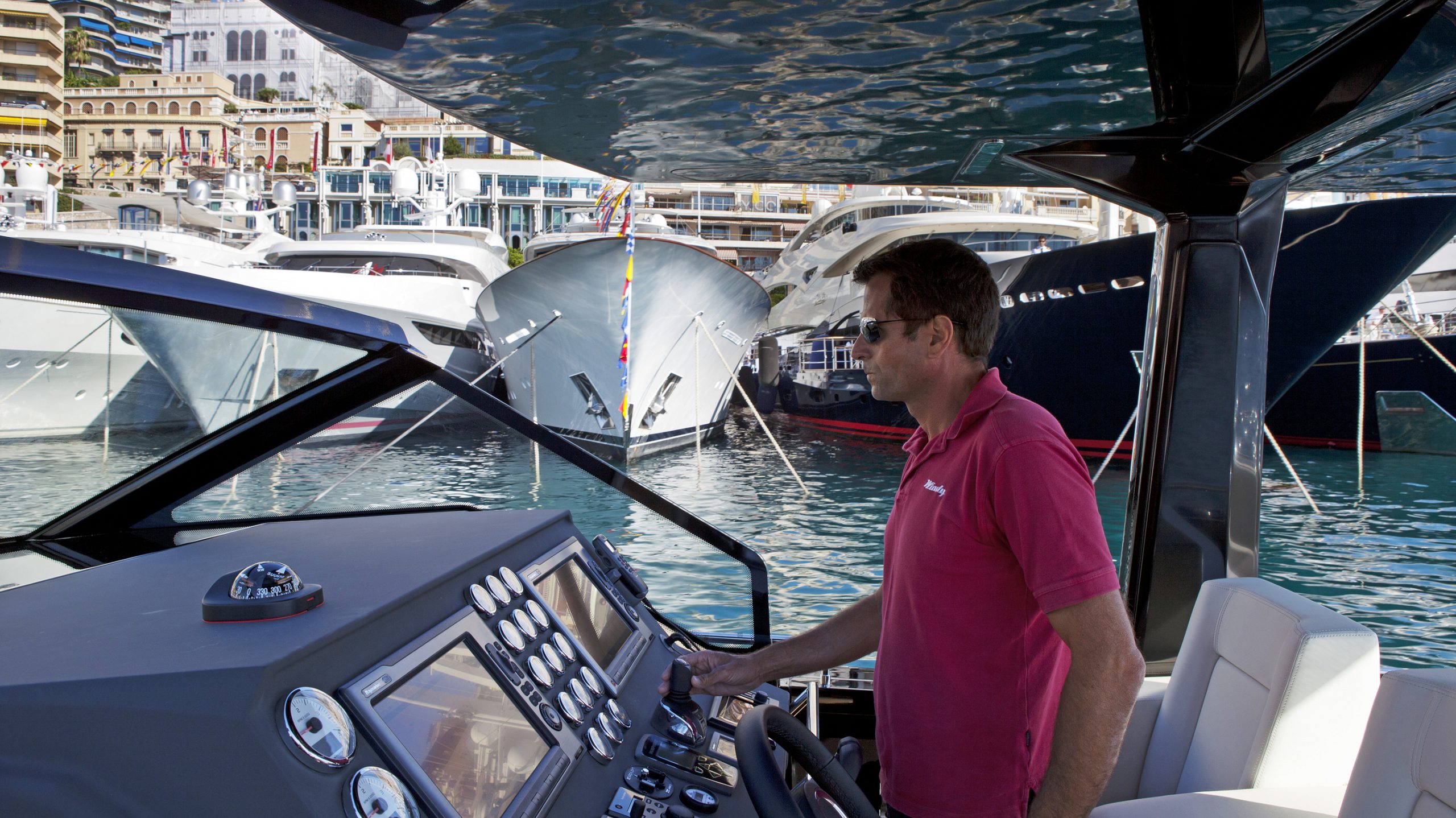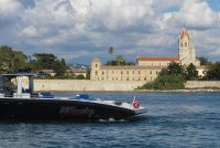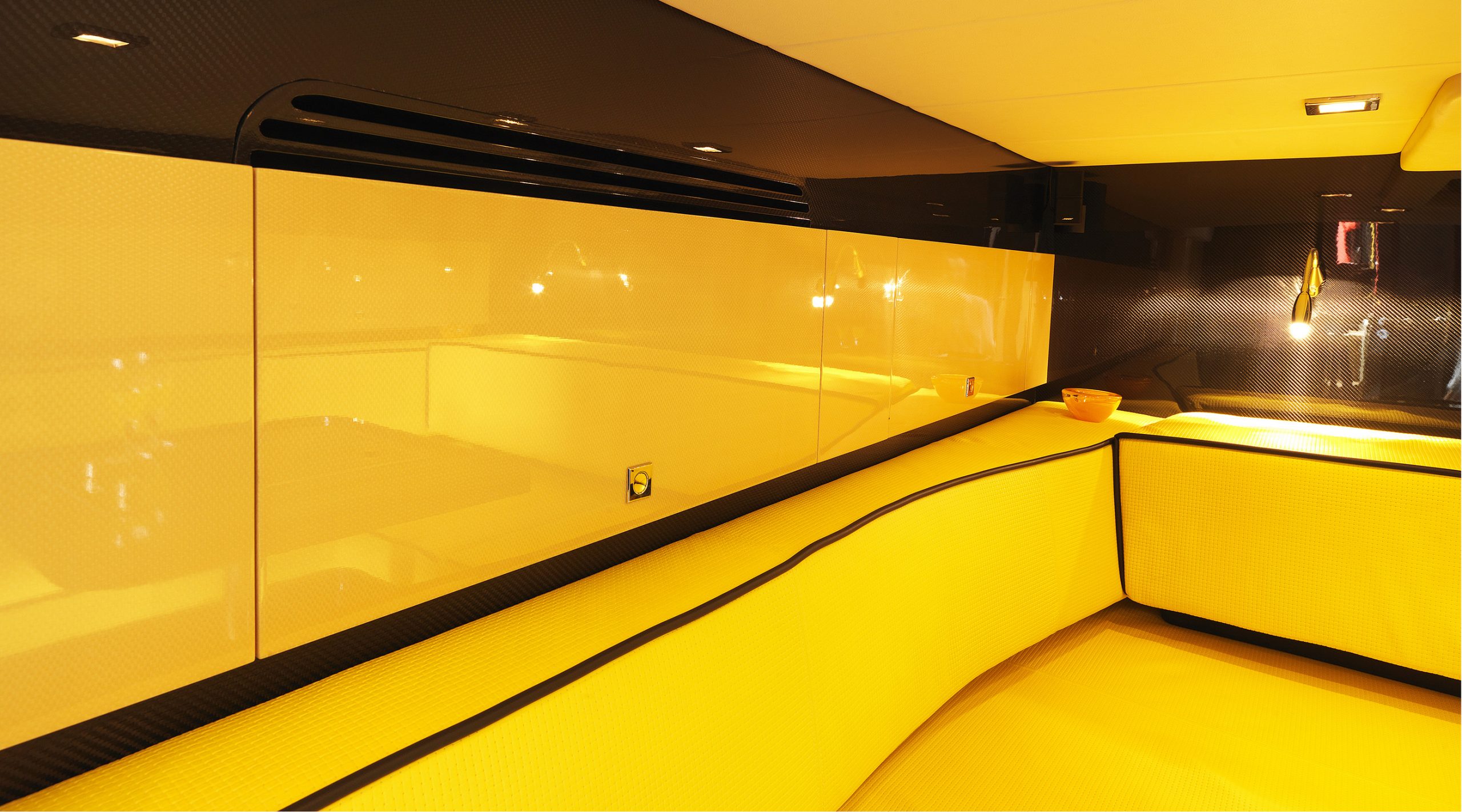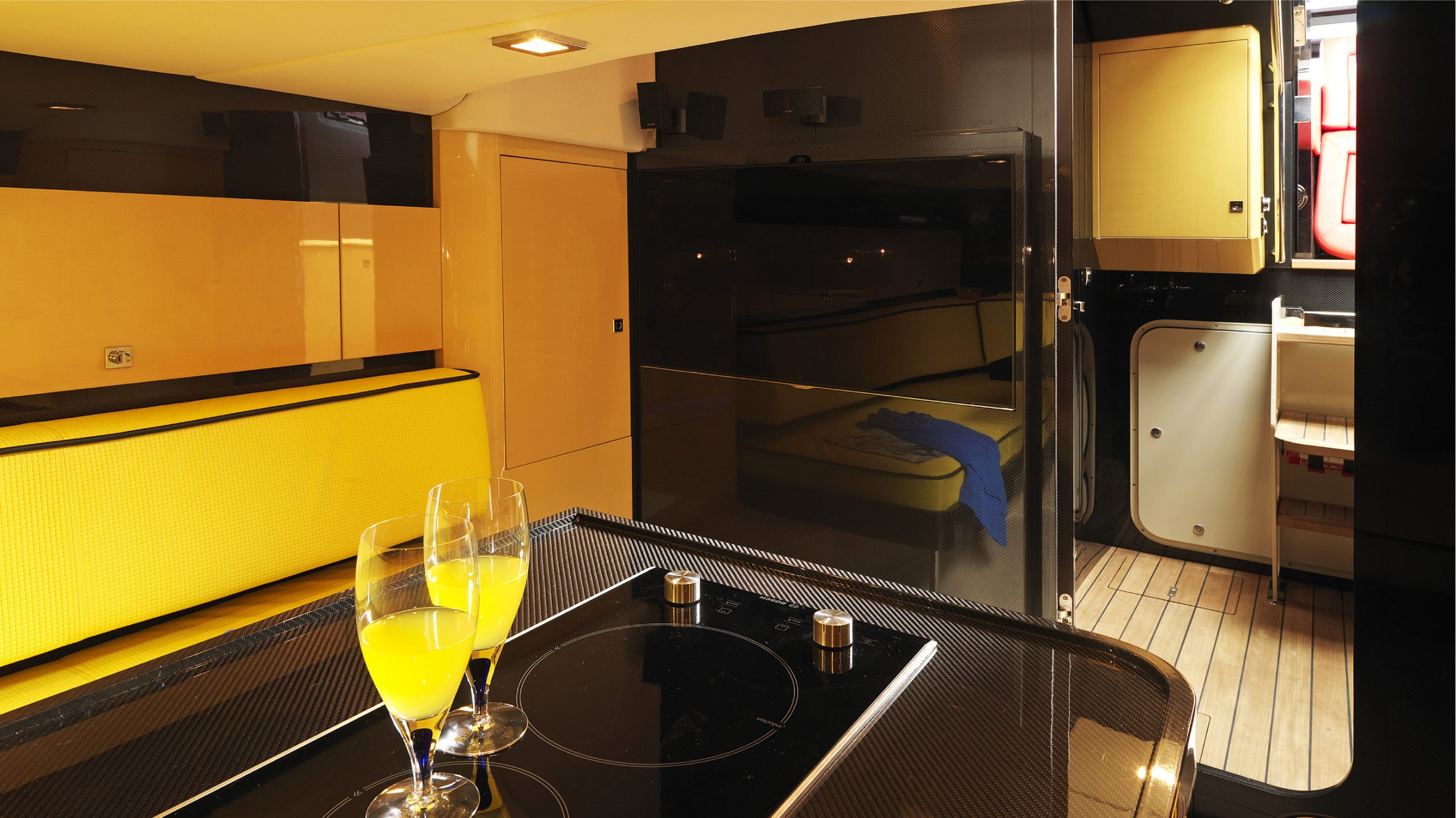 A spacious cockpit features three separate racing seats at the helm and three standing sport seats under the shade of the bimini. The teak deck provides open walkaround access from the raised foredeck to the additional seating, sun lounger and hydraulic bathing ladder aft – perfect for race spectating, swimming or picnicking at anchorage. A head with shower is located below decks, along with a double berth. Truly, a superyacht among tenders.