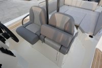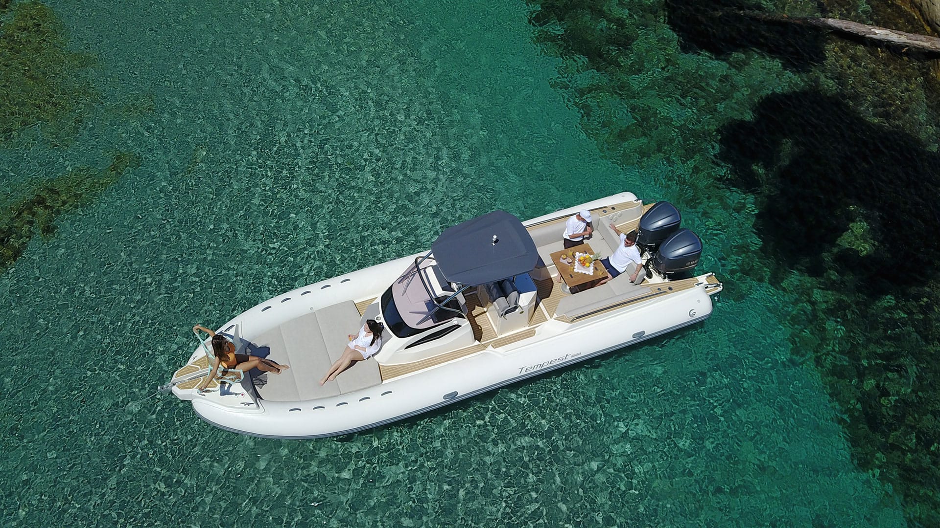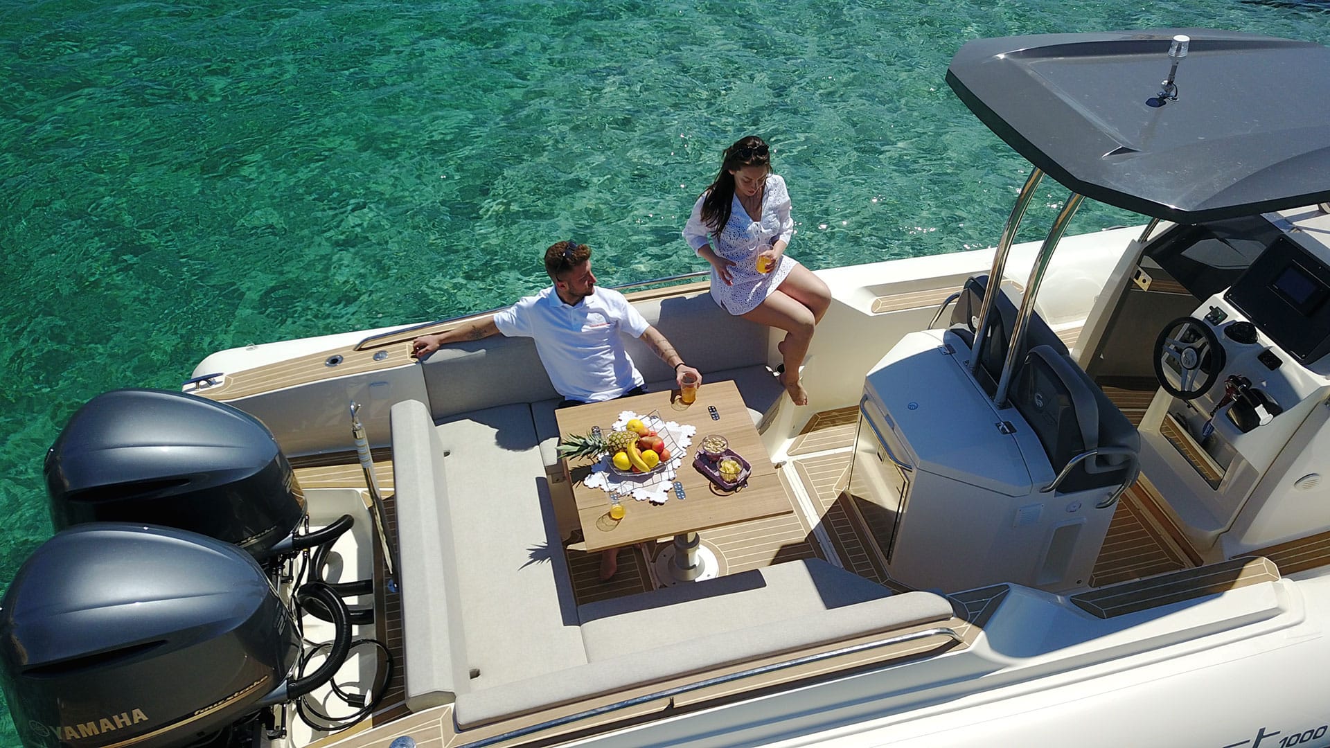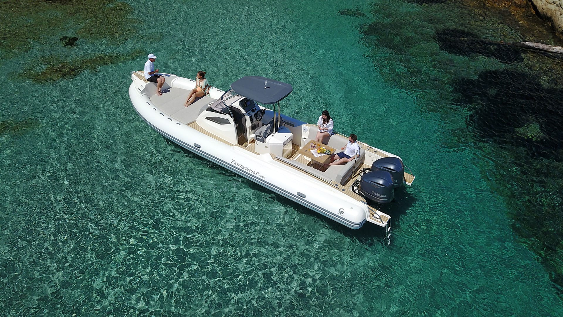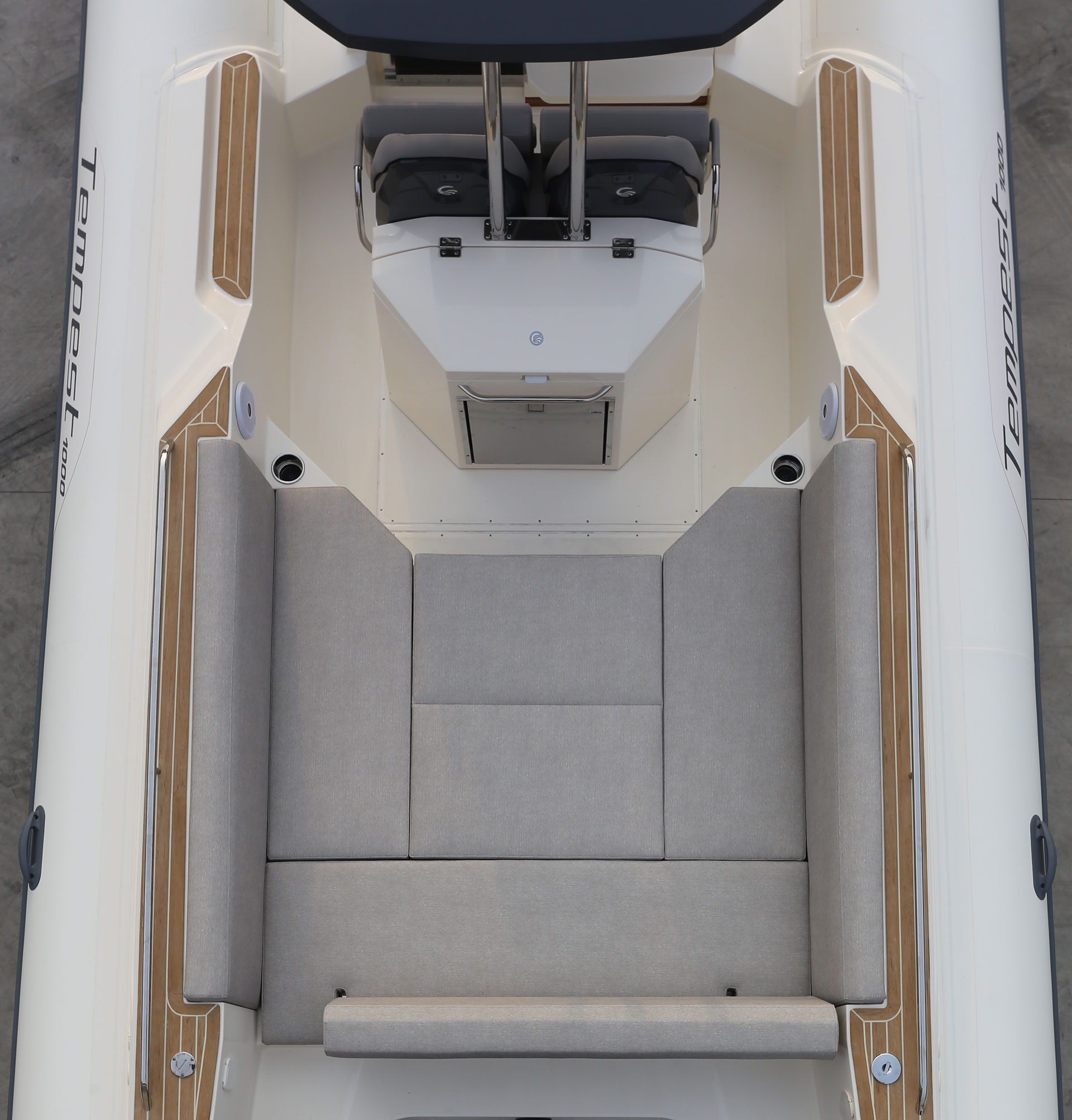 TEMPEST 1000 OPEN, has a dynamic and responsive nature. It’s a livable, comfy and safe unit. Sleek and well designed deck lines, empowered by the OPT hard top, fully integrated and functional. The ultimate space to enjoy unforgettable moment with family and friends is the “U” shaped stern bench, matched with the central teak table and the fridge installed in the driver bench. The double steering seats assure a comfy boating experience.Perfect both for long journeys and daily cruises.