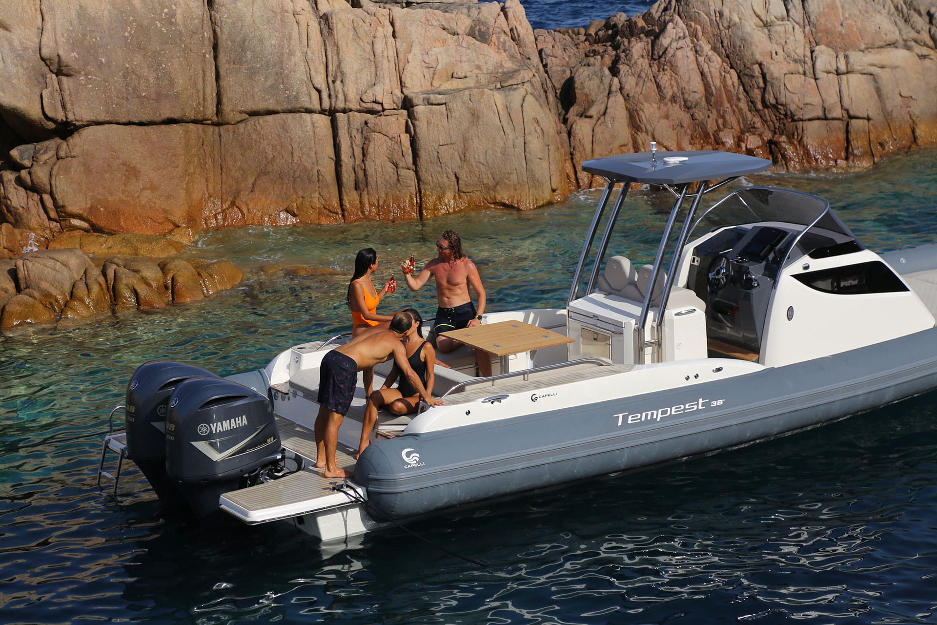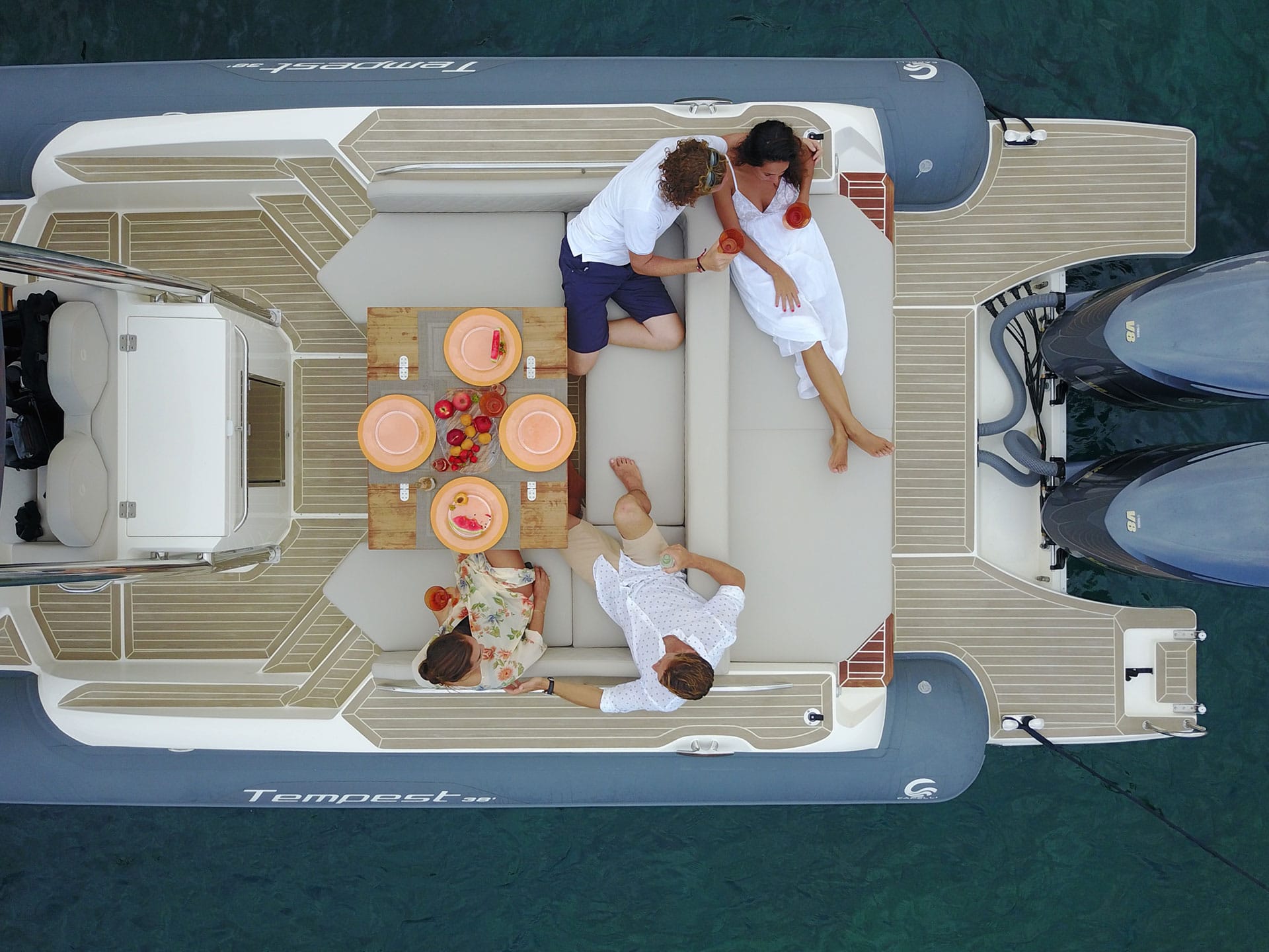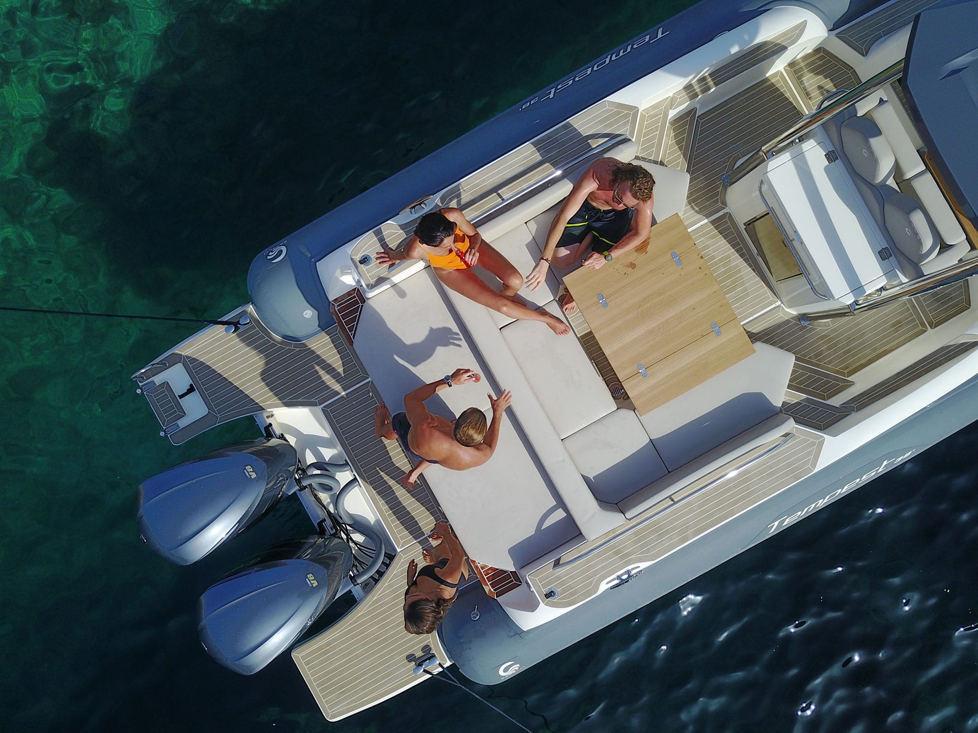 - Fixed stern teak table