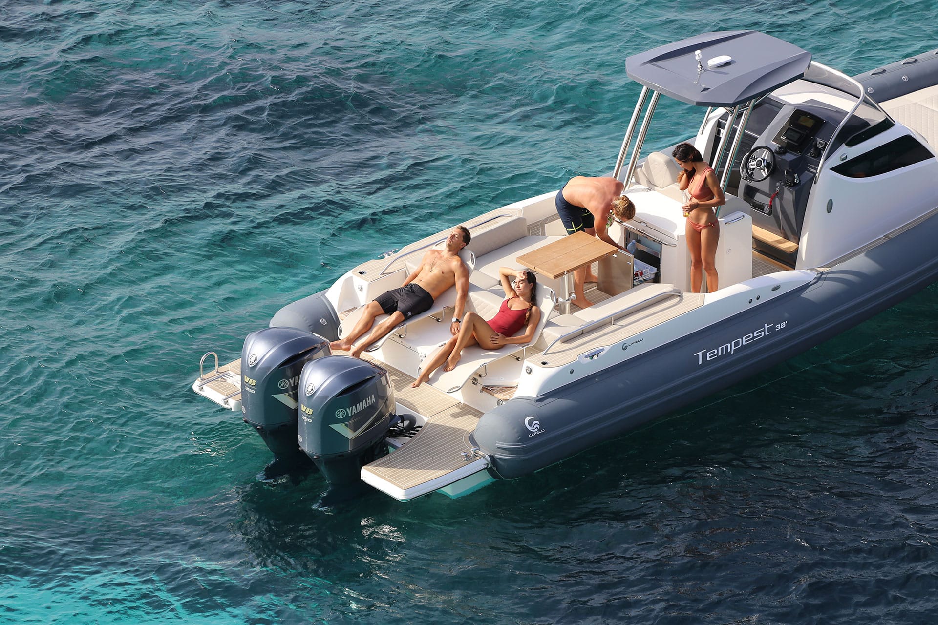 - Retractable pull-down teak table, electrically controlled with additional sundeck cushion