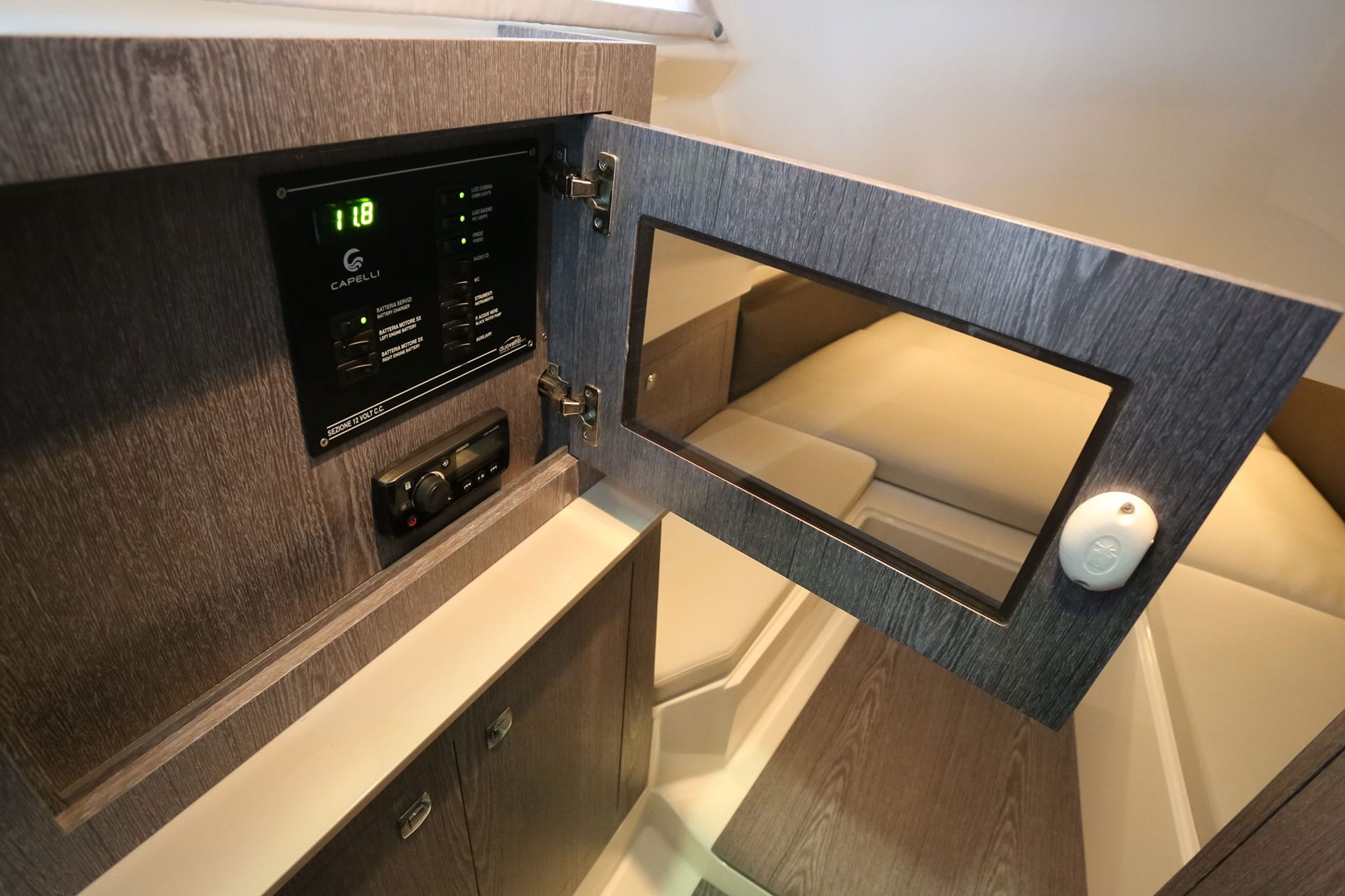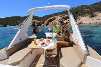 - Retractable pull down teak table, electrically controlled with additional sundeck cushion