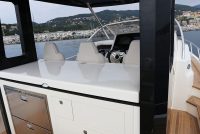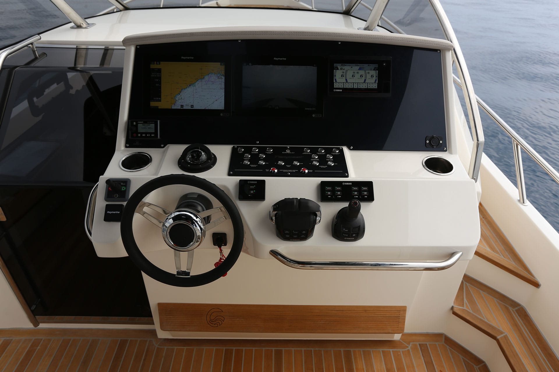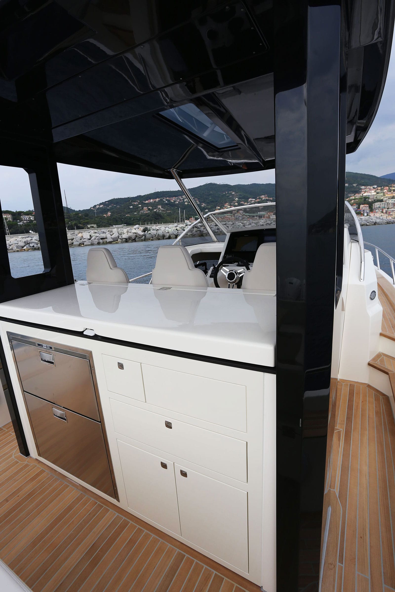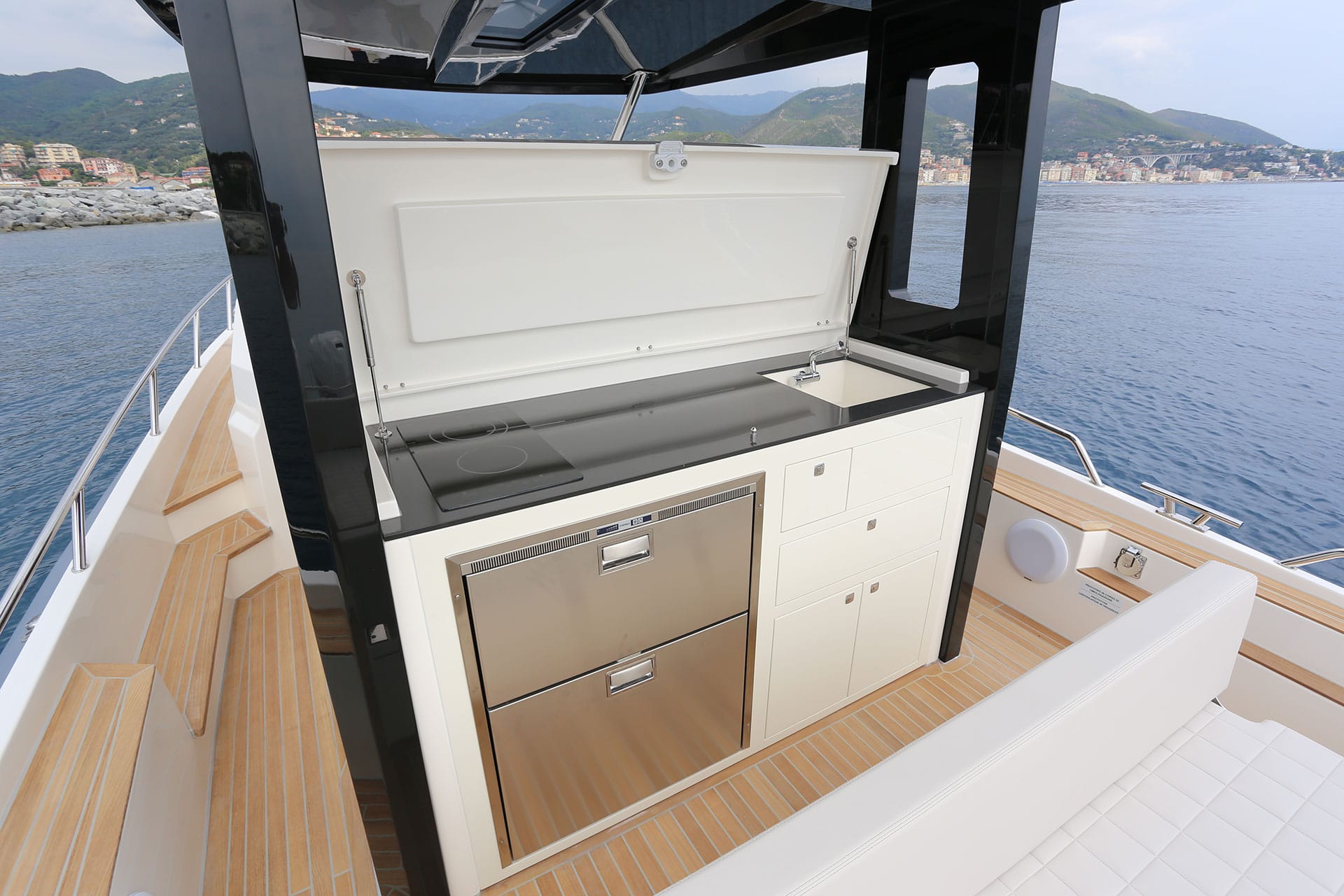 - Steering bench with three seats, deck compartment with sink, electric Cooker (#2) and double drawer fridge (210 lt)