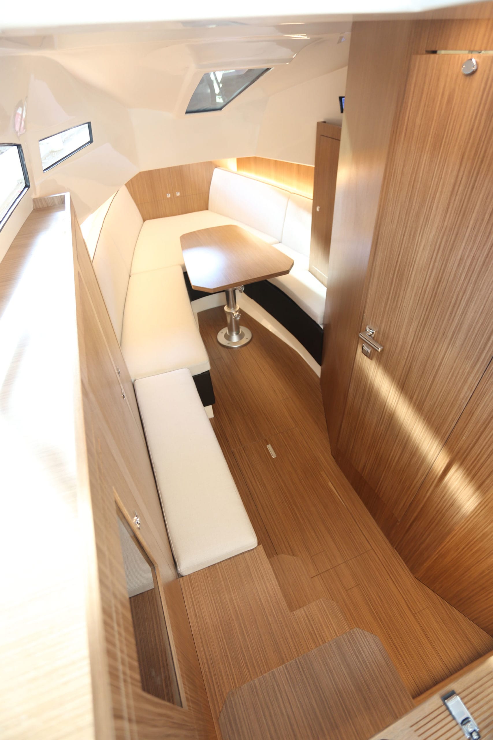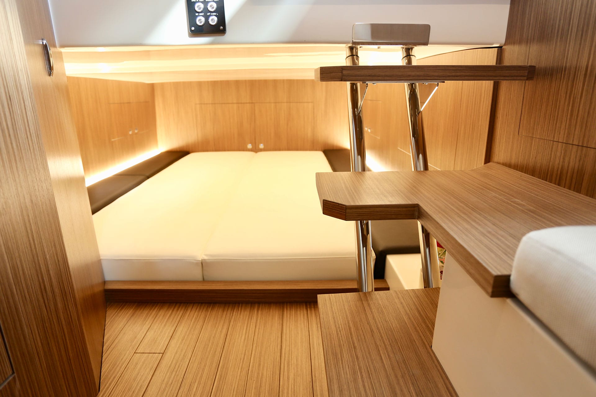- Pull-down stern teak table (electrically controlled) with additional stern cushion