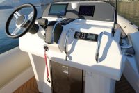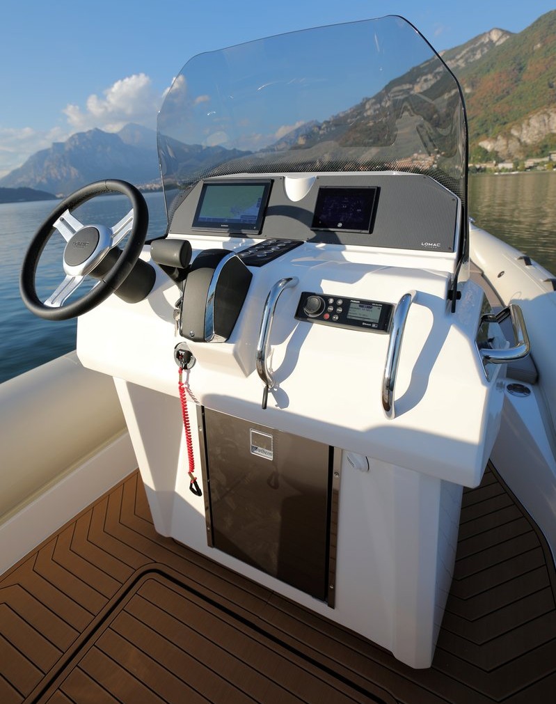 - Driving console complete with windshield with handrail, passenger handles and stainless steel steering wheel