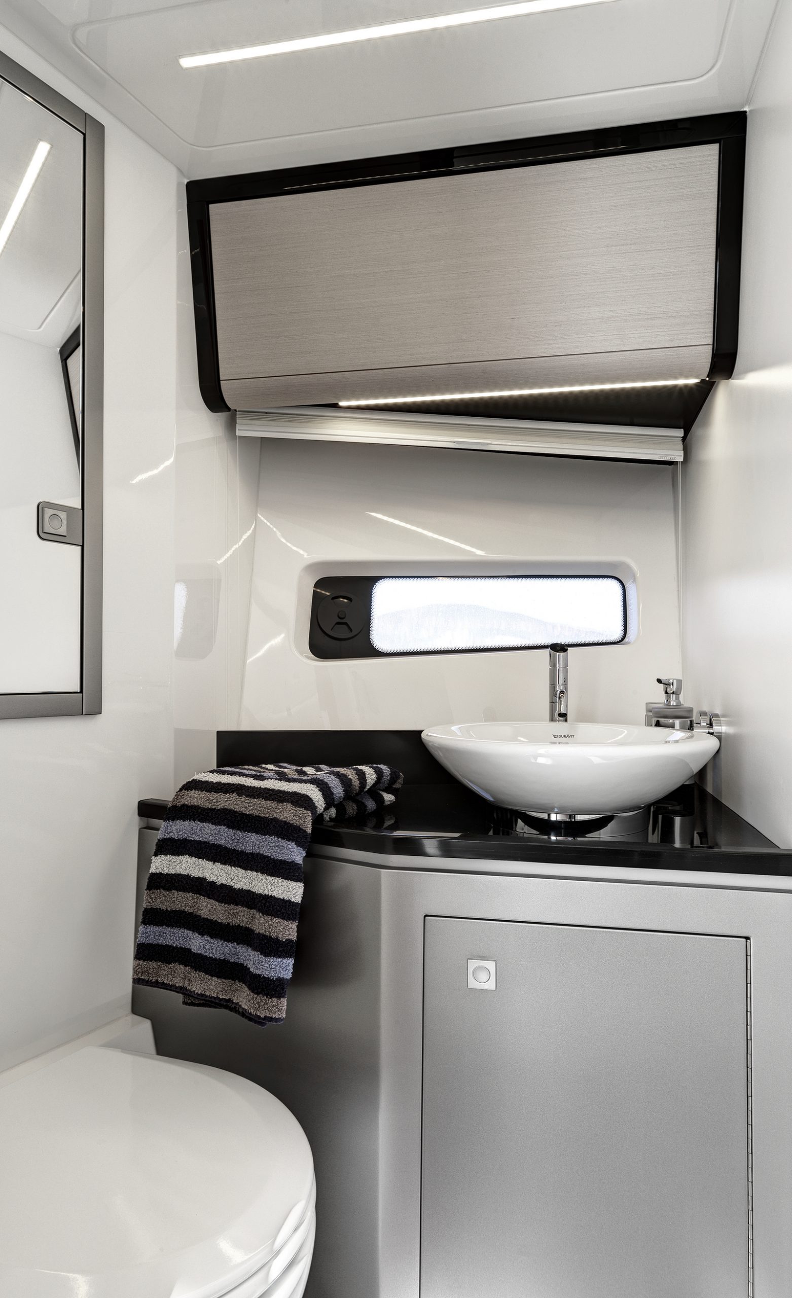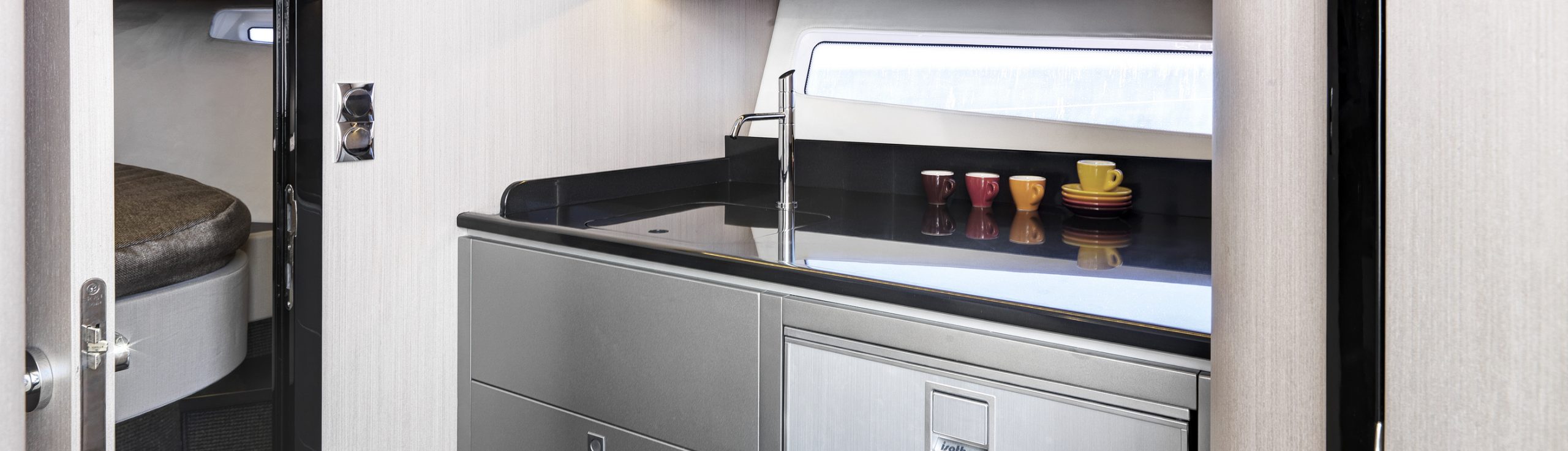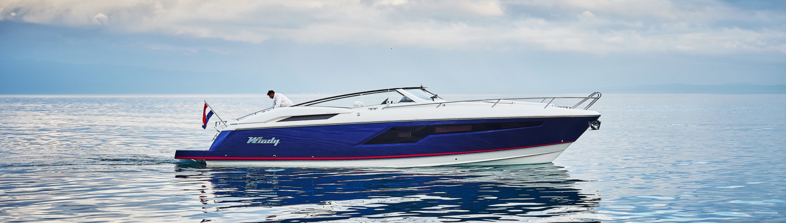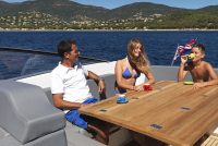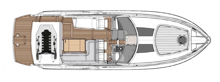 Power comes courtesy of Volvo sterndrives with electronic controls, while a tender garage and Windy’s ingenious canopy system complete an unbeatable package.