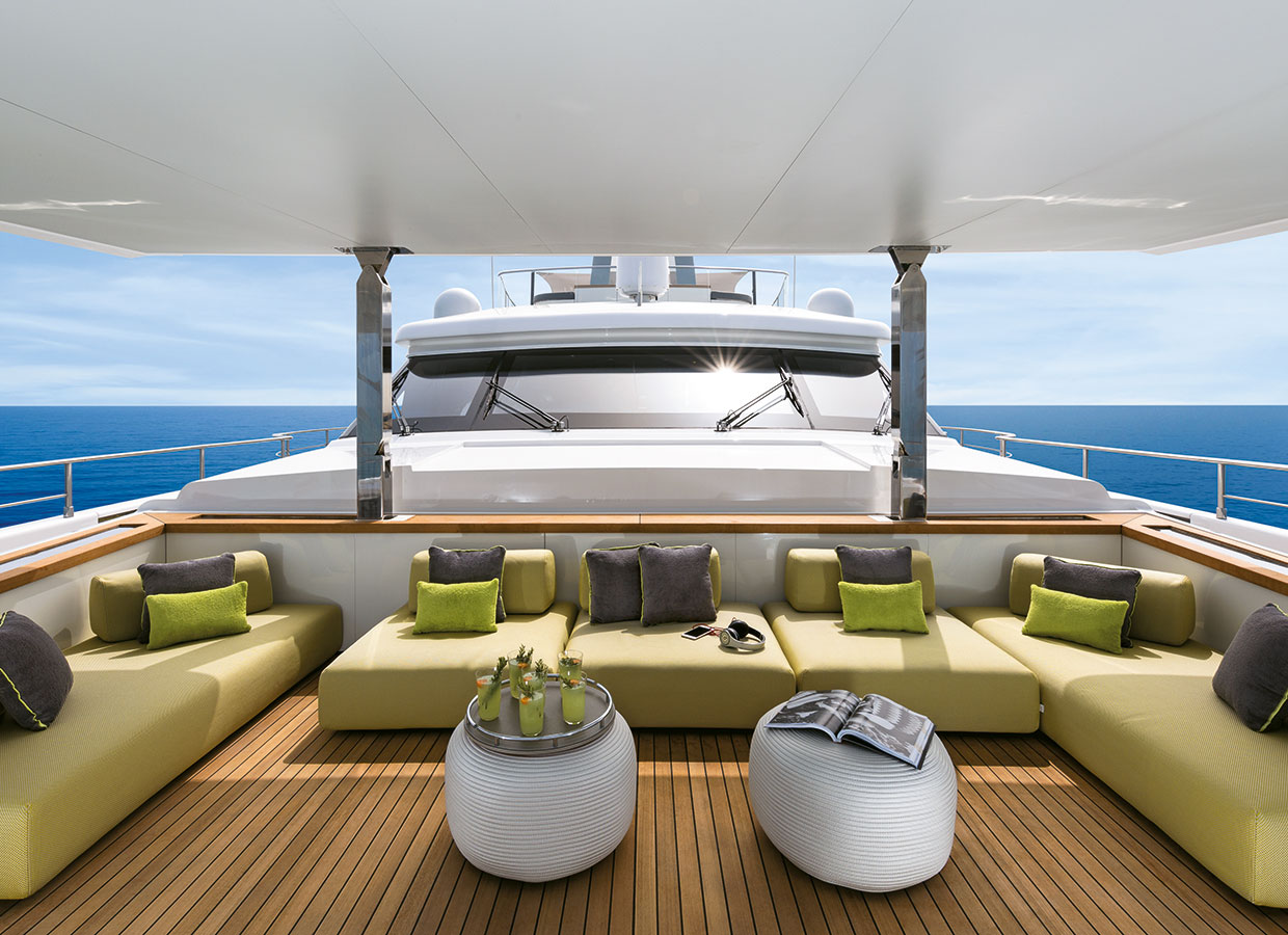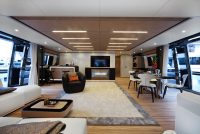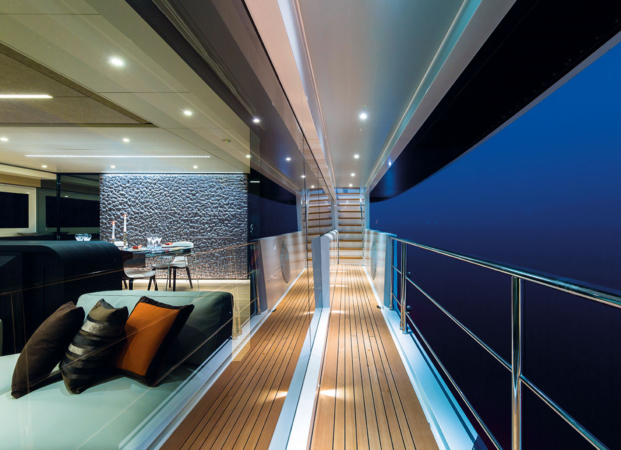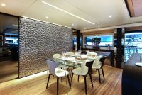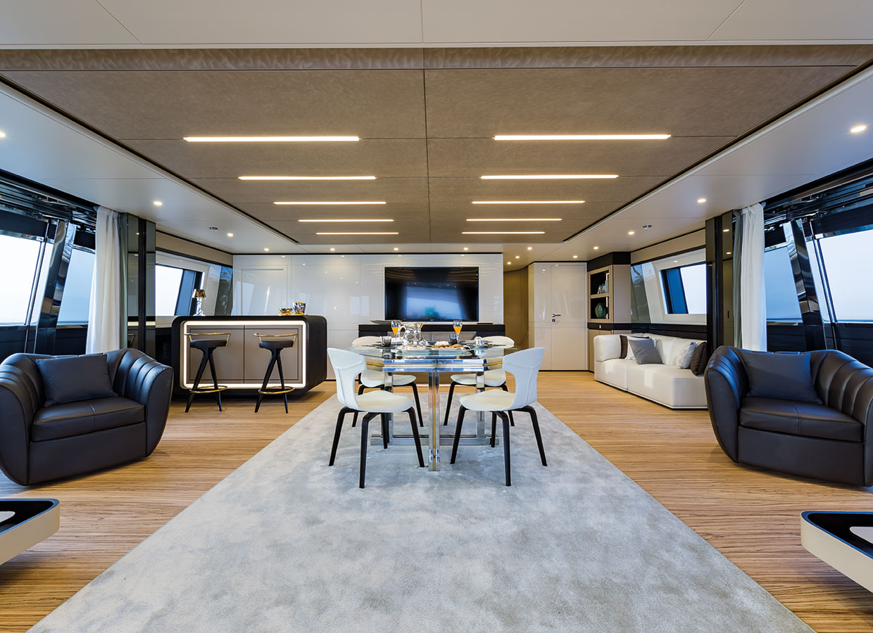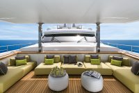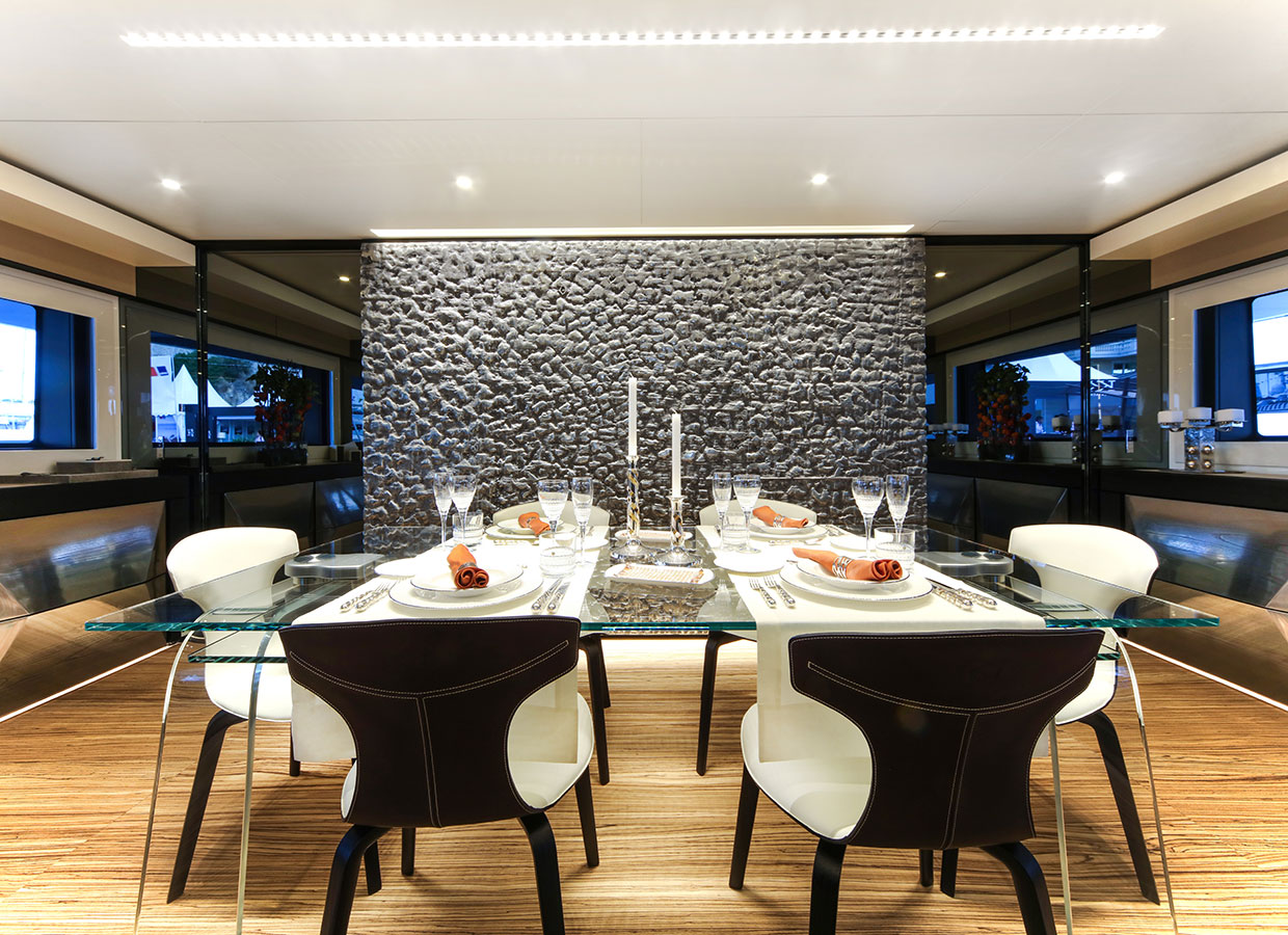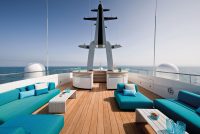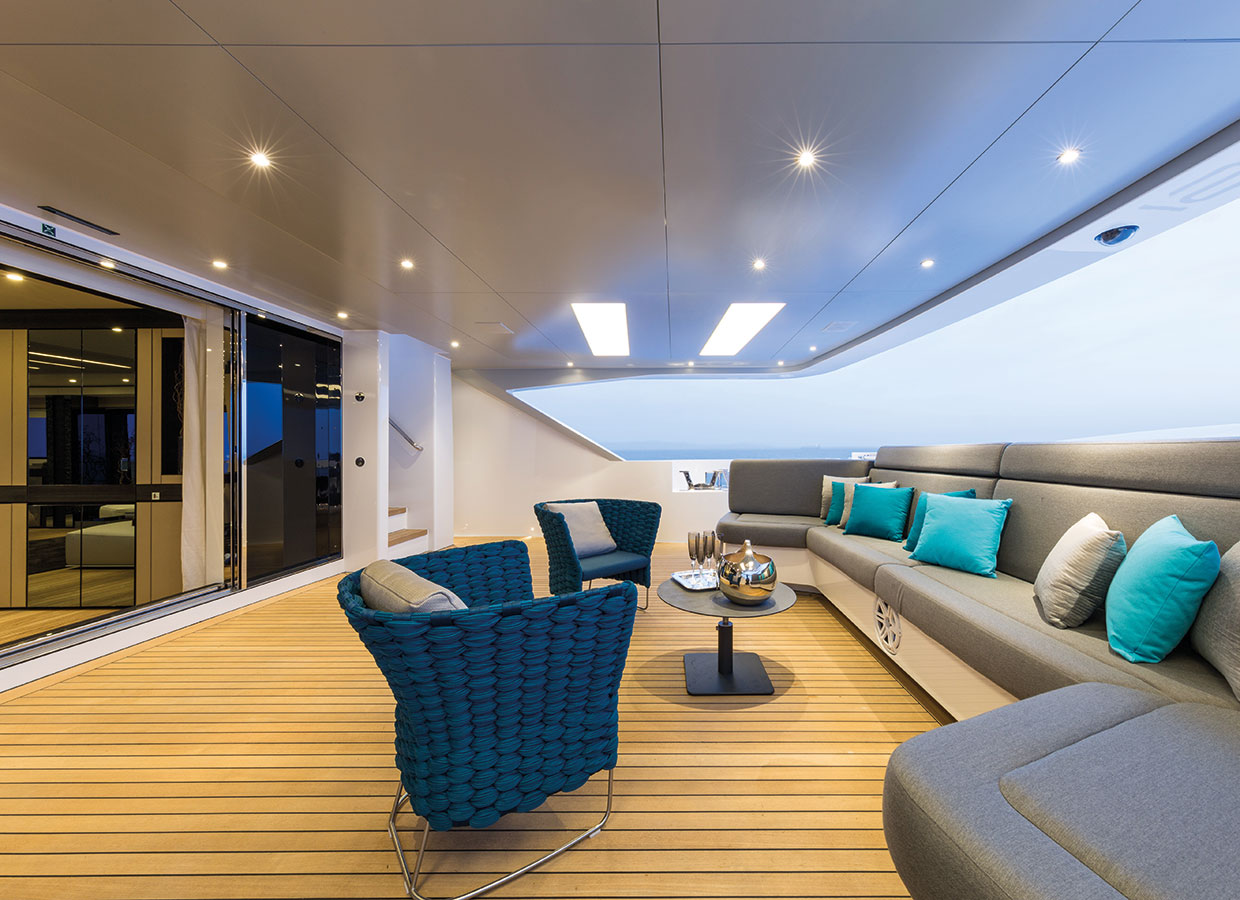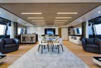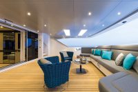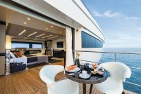 On the upper deck, the Sky Lounge has an area with sliding doors that when retracted create the feeling of open but sheltered alfresco dining at a table able to accommodate the full complement. The upper deck also has two balconies creating the type of space that you would usually only expect on yachts of over 60 metres.