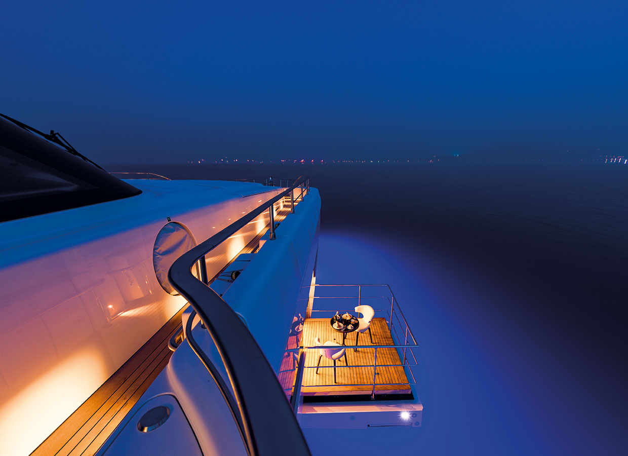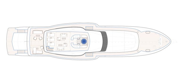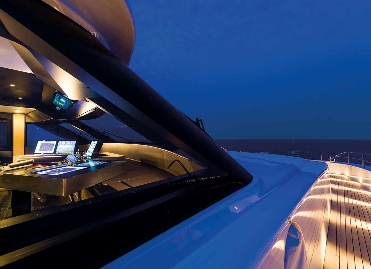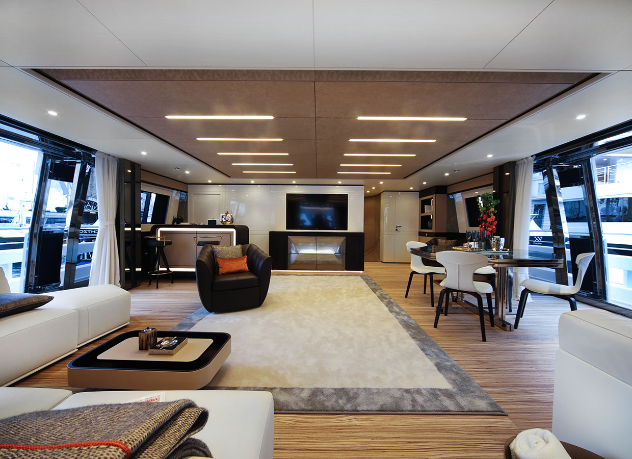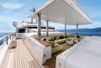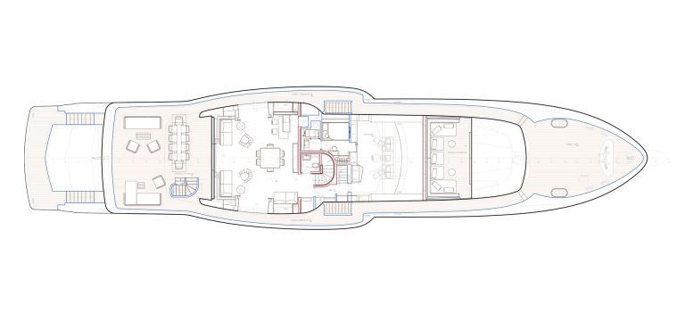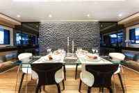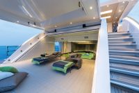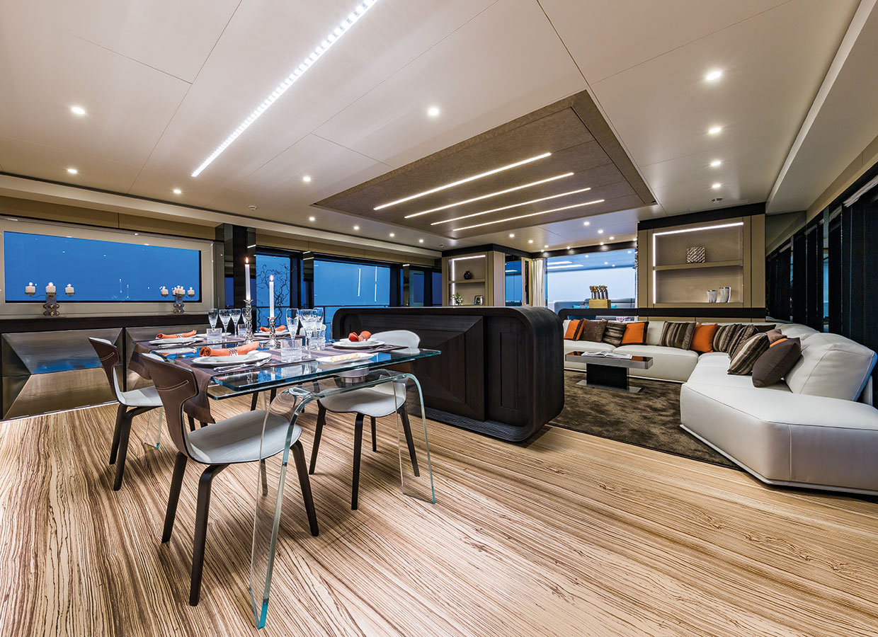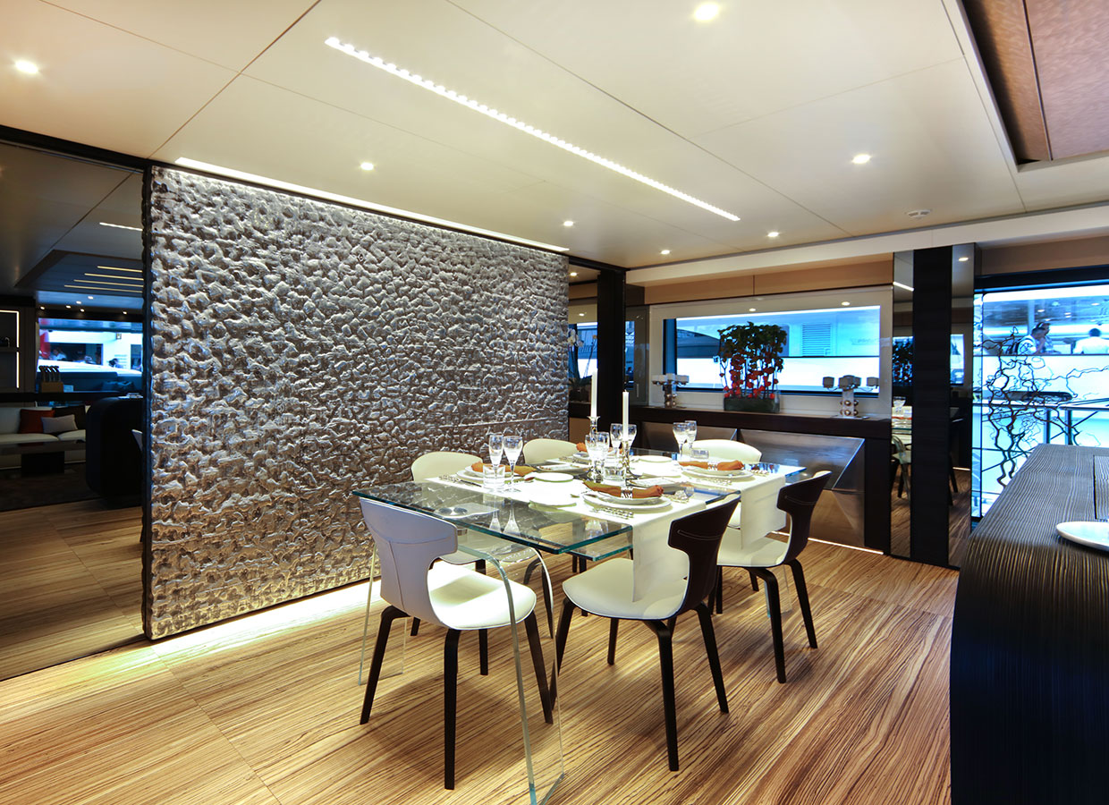 On the upper deck, the Sky Lounge has an area with sliding doors that when retracted create the feeling of open but sheltered alfresco dining at a table able to accommodate the full complement. The upper deck also has two balconies creating the type of space that you would usually only expect on yachts of over 60 metres.