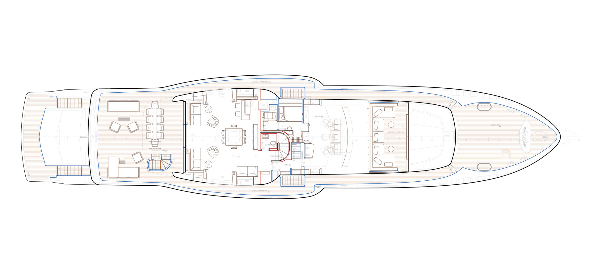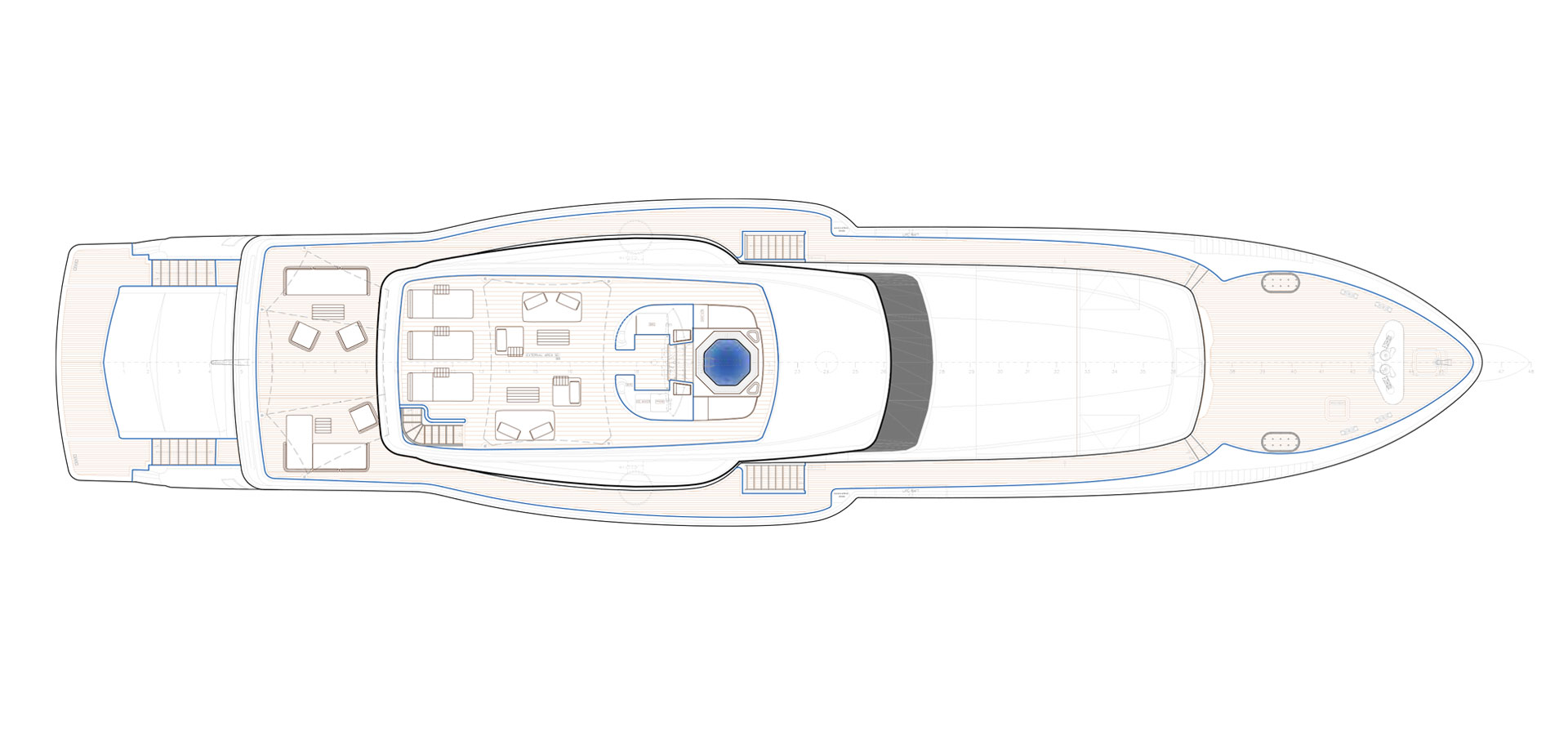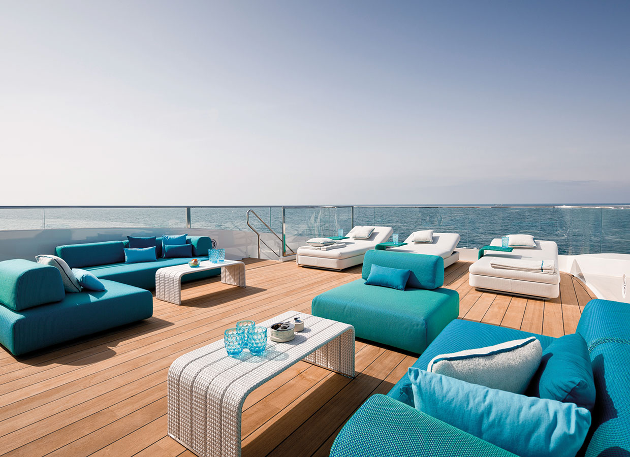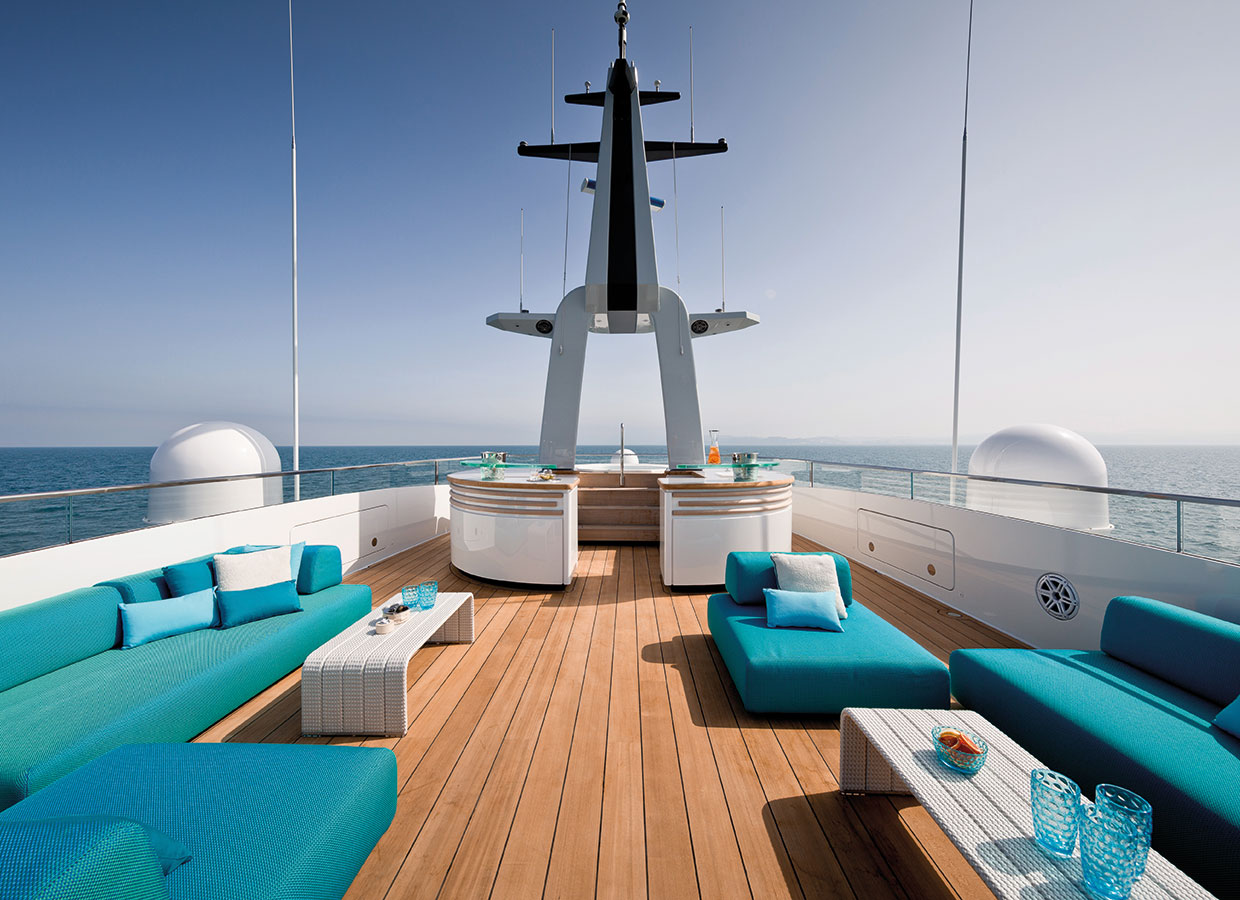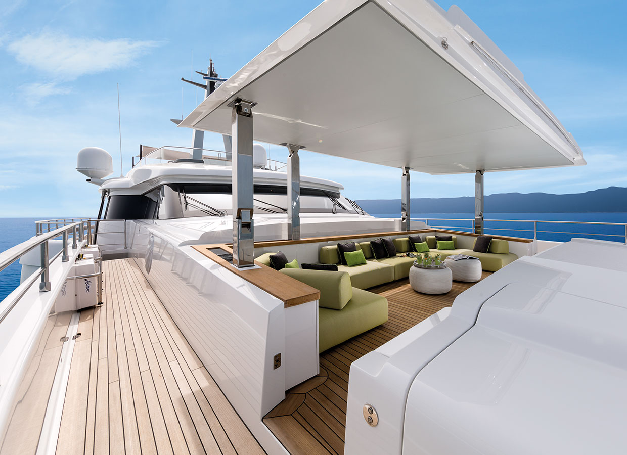 On the upper deck, the Sky Lounge has an area with sliding doors that when retracted create the feeling of open but sheltered alfresco dining at a table able to accommodate the full complement. The upper deck also has two balconies creating the type of space that you would usually only expect on yachts of over 60 metres.