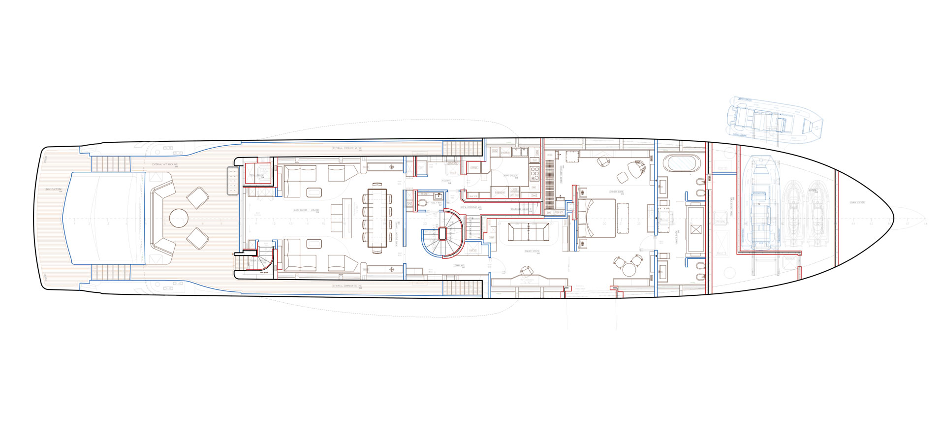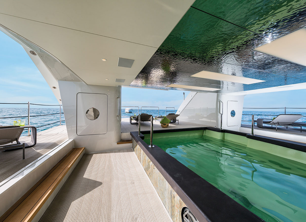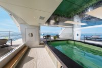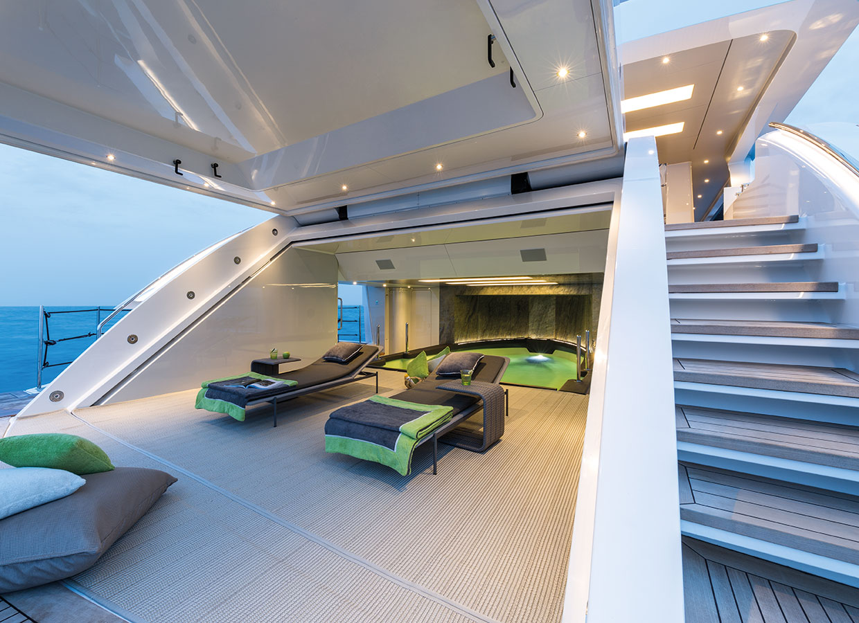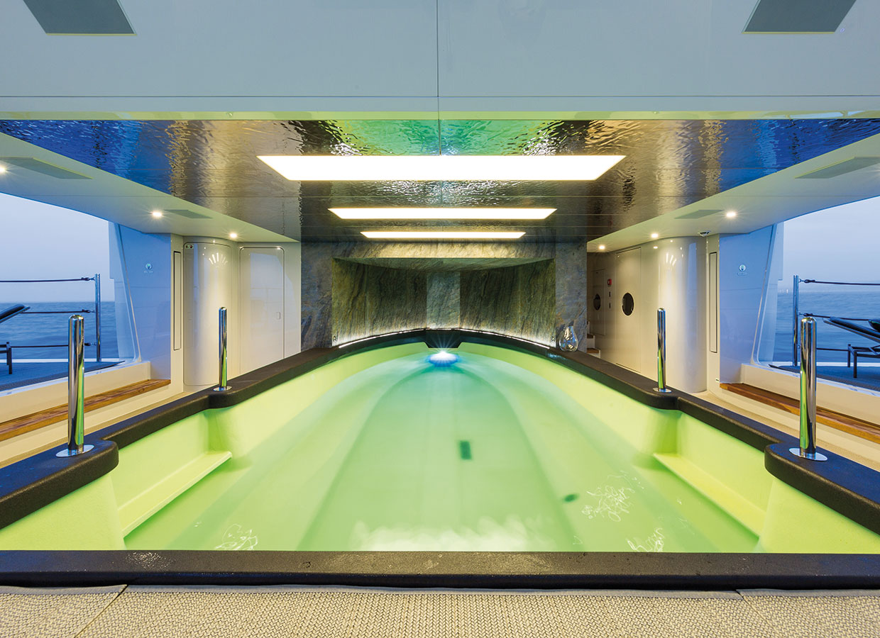 With the tender deployed, this space becomes a large salt water pool housed below the main deck. In addition, the floating launching system makes exit and entry manoeuvres with the tender simple for the crew.