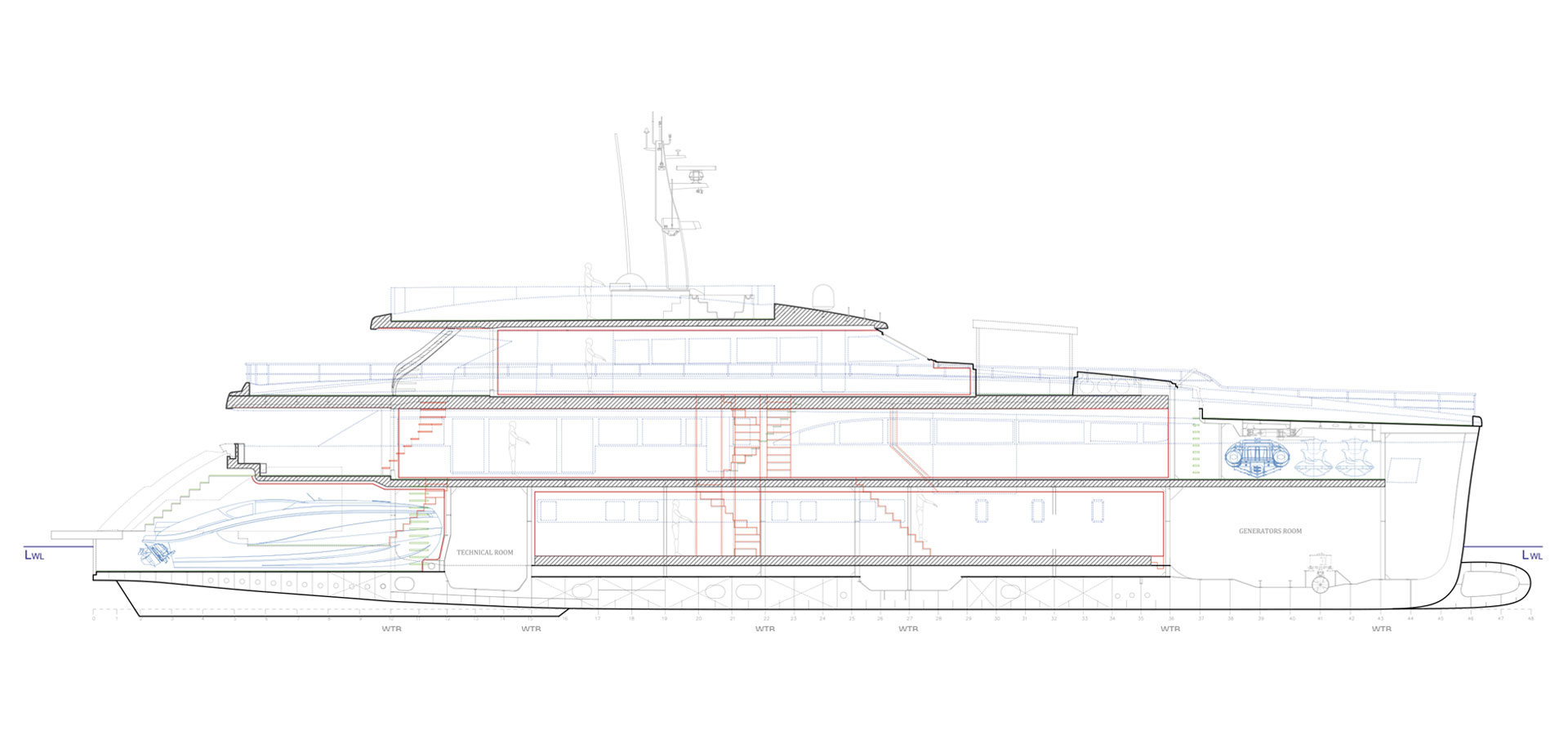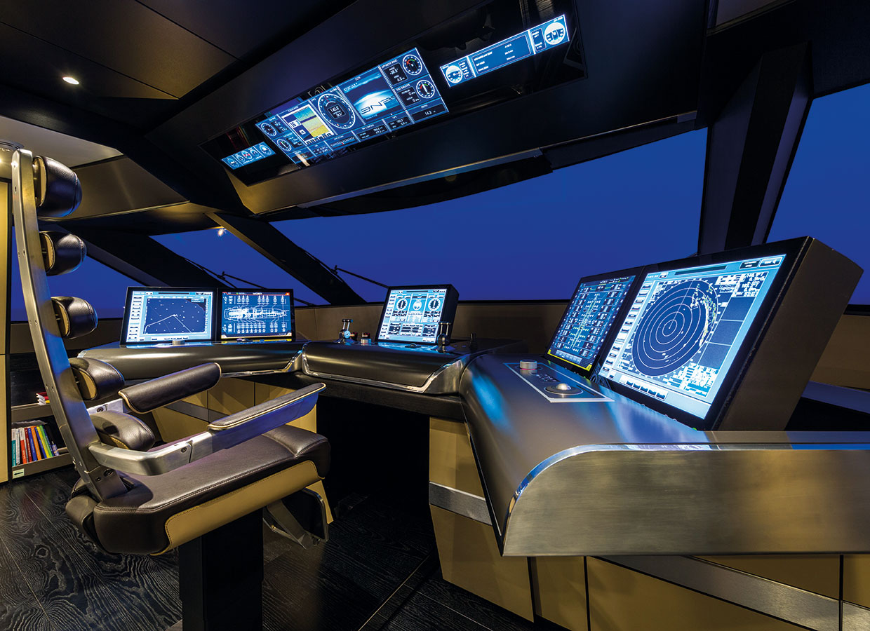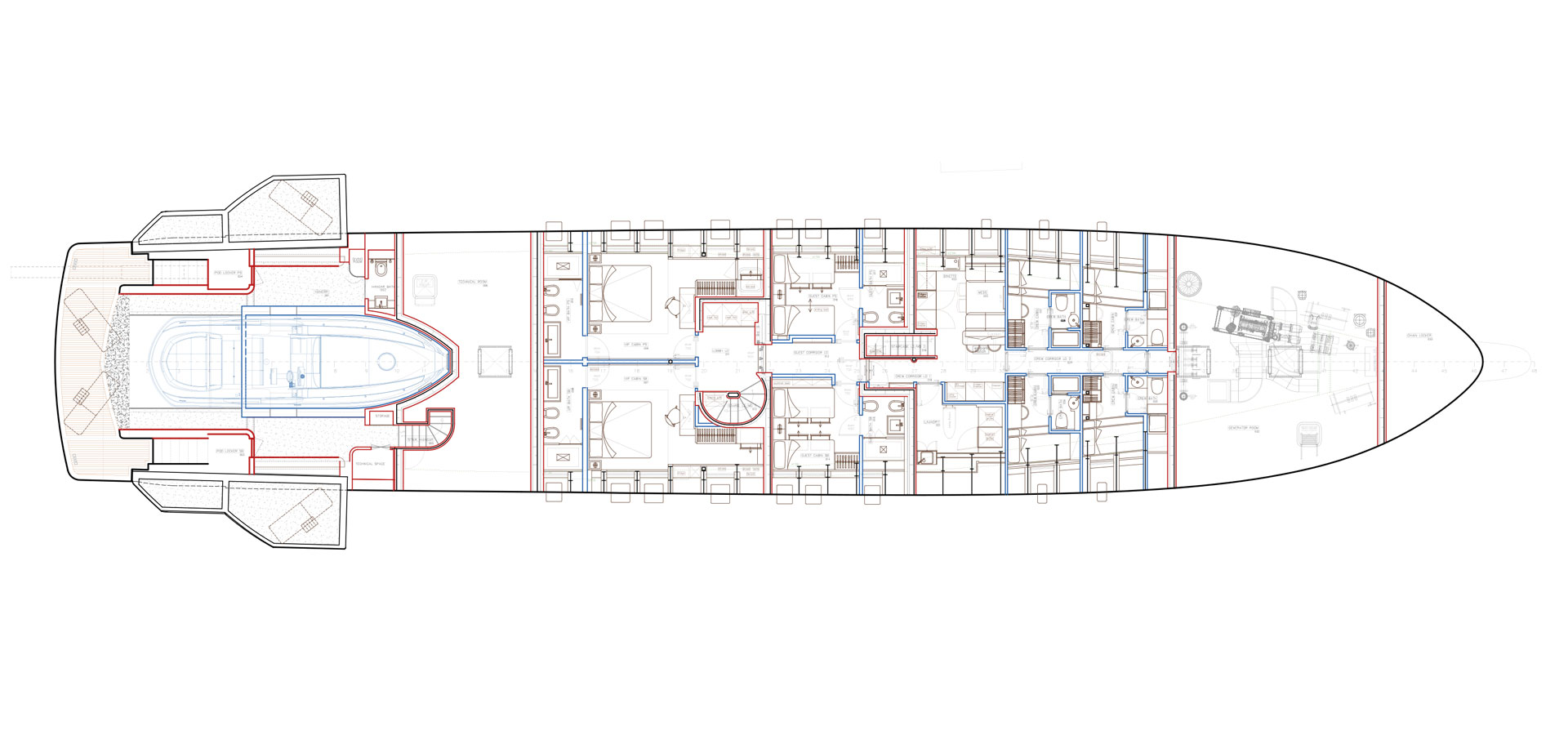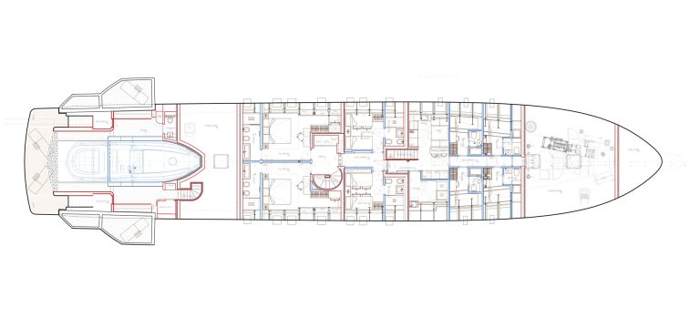 The traditional engine room has been replaced by two separate units: the Power Generator Room in the bow and the Technical Room in the stern where the lithium polymer (LiPo) batteries are housed. This frees up one of the largest parts of the hull, so more spacious guest cabins can be designed at the heart, and the most stable zone, of the yacht.