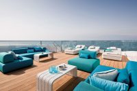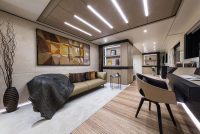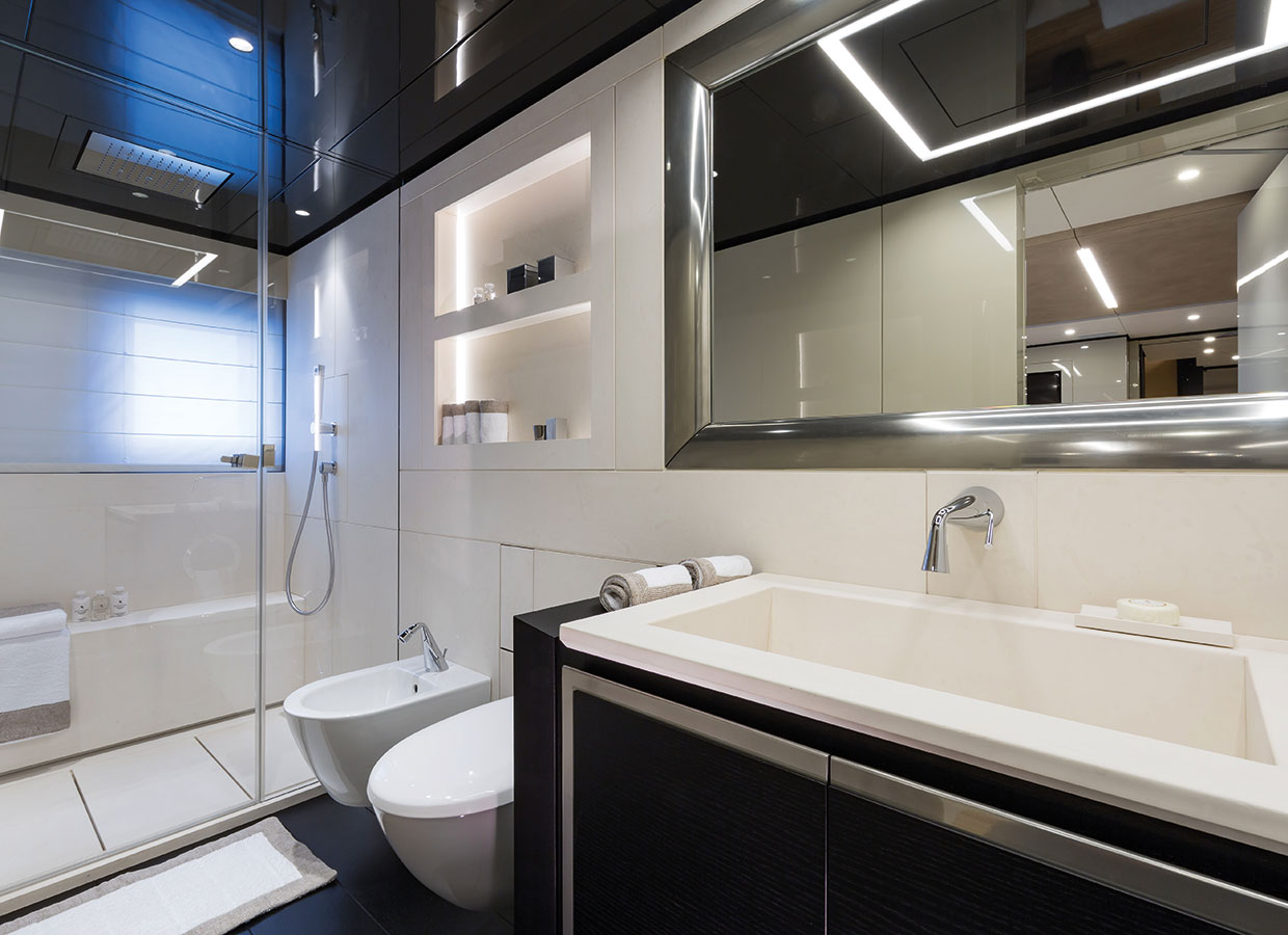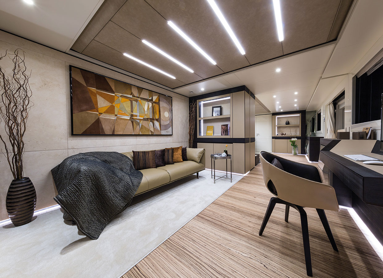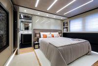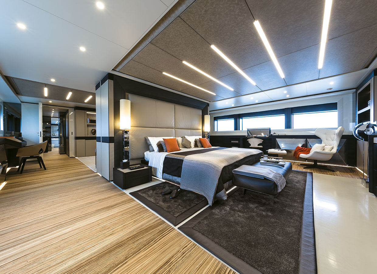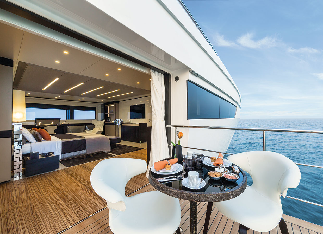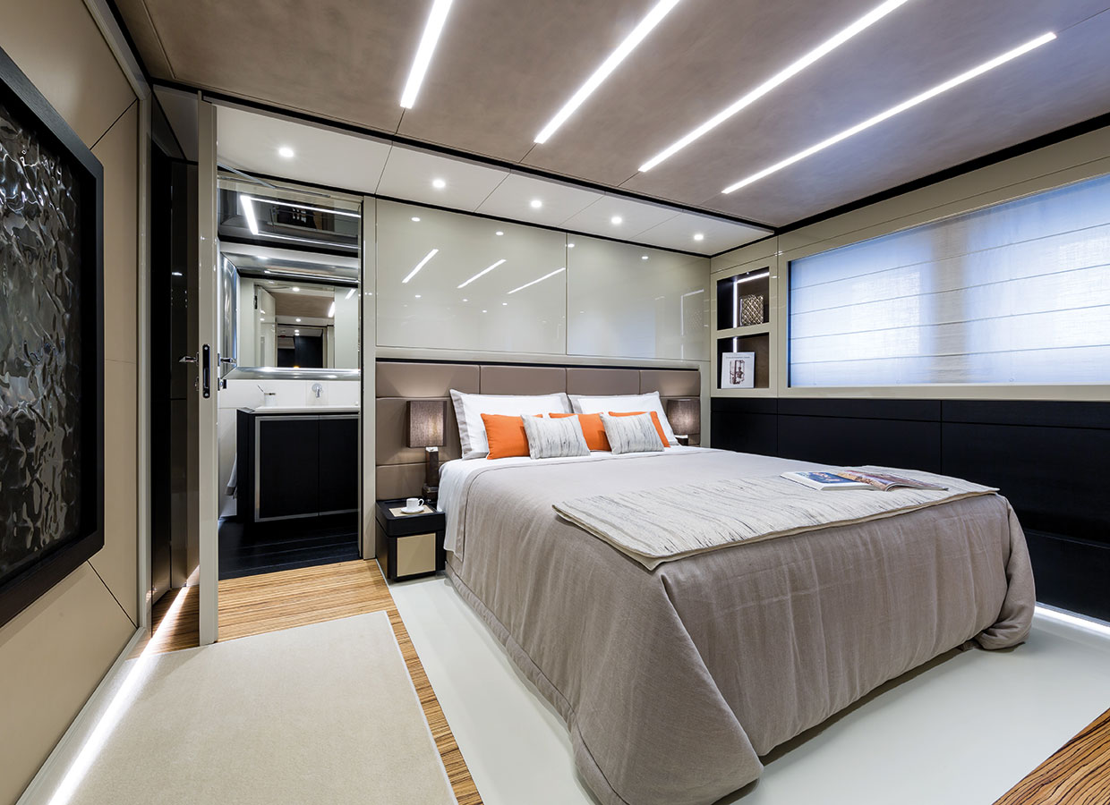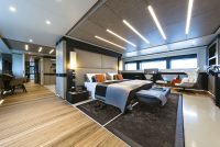 On the main deck towards the stern, there is a wide external entertaining area and an incredibly spacious internal lounge divided into two. In front of the lounge, towards the bow, the full-width owner’s suite boasts a 5.6m2 balcony overlooking the sea. This suite too can be divided into two areas by sliding doors.