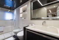 Guests are accommodated in four large cabins with private bathrooms at their disposal, two of which are VIP cabins while the other two also feature pull-down beds for children. The elegance and the contemporary style of the interiors are enriched by the use of Poltrona Frau hides. This company has created and perfected a unique 21-step leather crafting method where natural pieno fiore fine grain leather is dyed with ingrained colour so that in case of a scratch, the underlying material is not exposed.