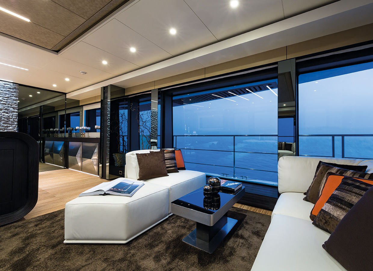 Wide floor-to-ceiling windows surround the lounge on the main deck allowing natural light to pleasantly illuminate the living areas while providing magnificent views of the yacht’s surroundings.