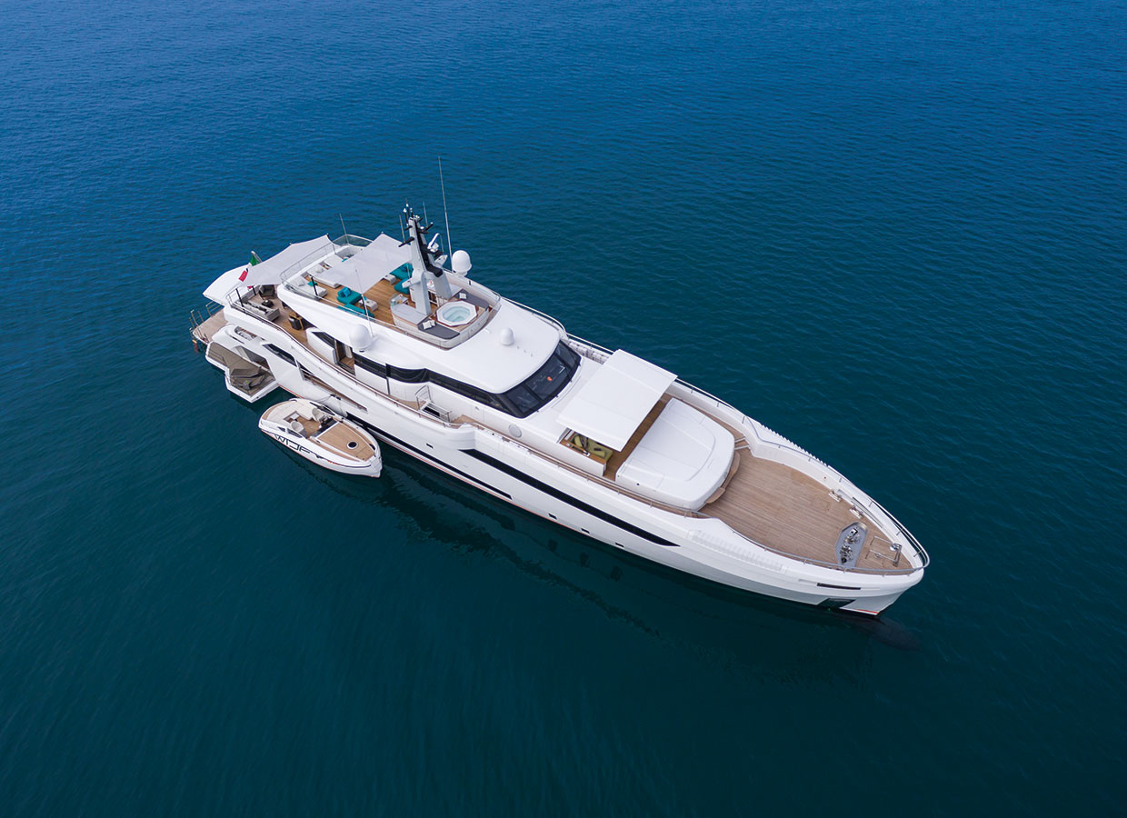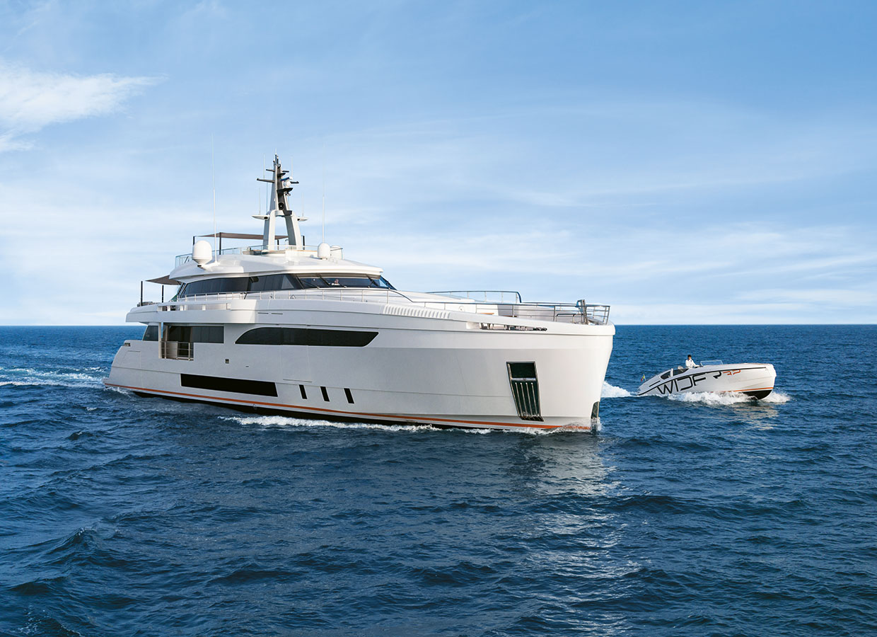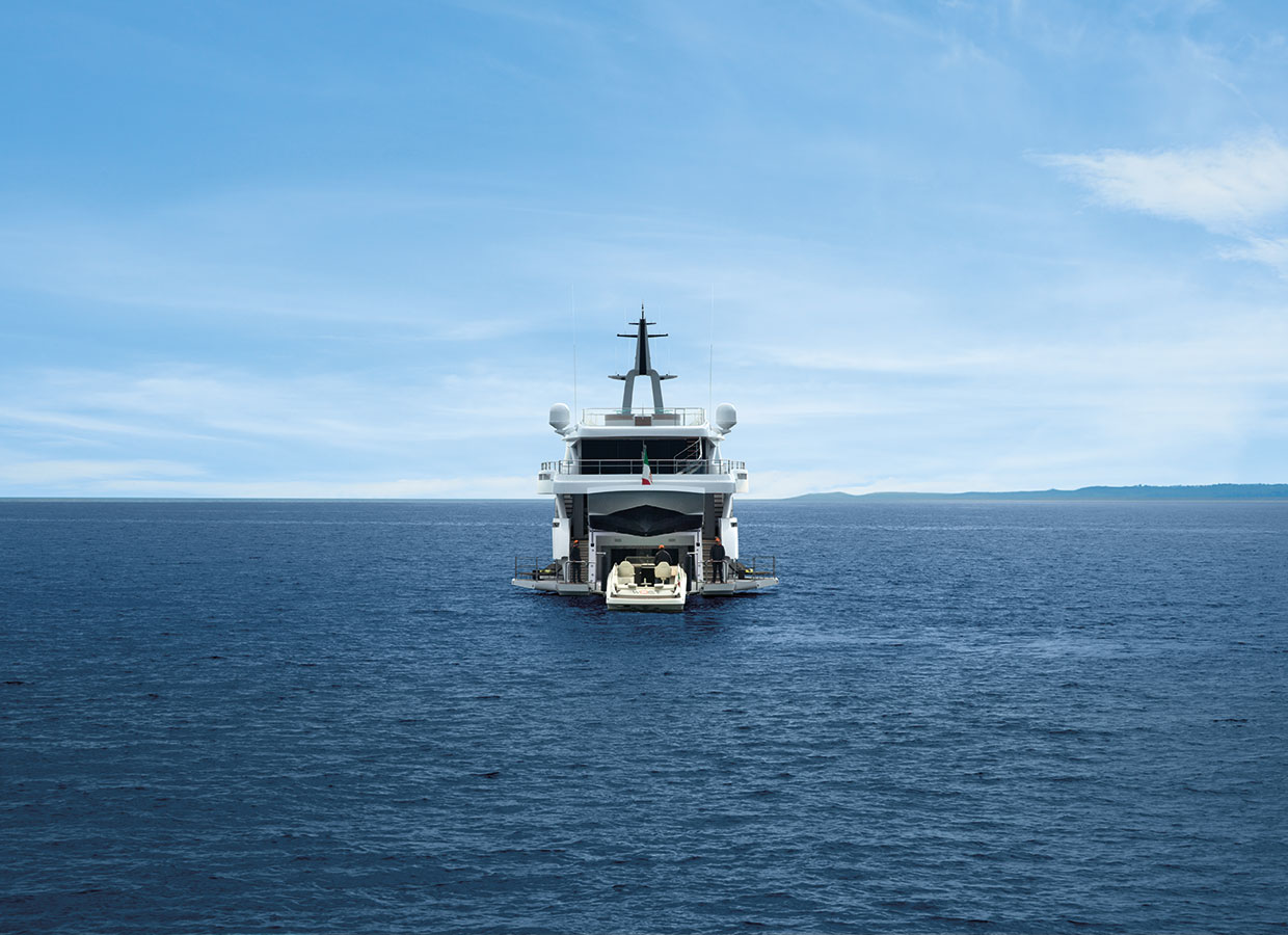 Thanks to the Floating Launching System, the stern of the WIDER 150 is an ideal hangar for a designer tender like the WIDER 32.