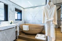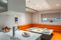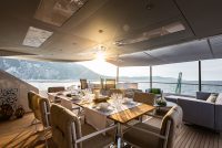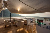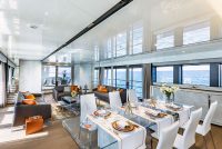 On the main deck, as well as a spacious lounge again with full height windows making it extremely bright, there is a gym and a sauna. On the upper deck, there is the Sky Lounge and a dining area with sliding doors, which once retracted create the feeling of an open but sheltered alfresco dining area.