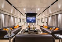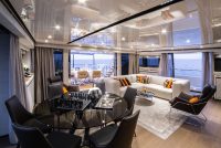 Wide floor-to-ceiling windows envelop the lounges of the main deck, allowing natural light to pleasantly illuminate the spacious living areas and allow magnificent views of the yacht’s surroundings.