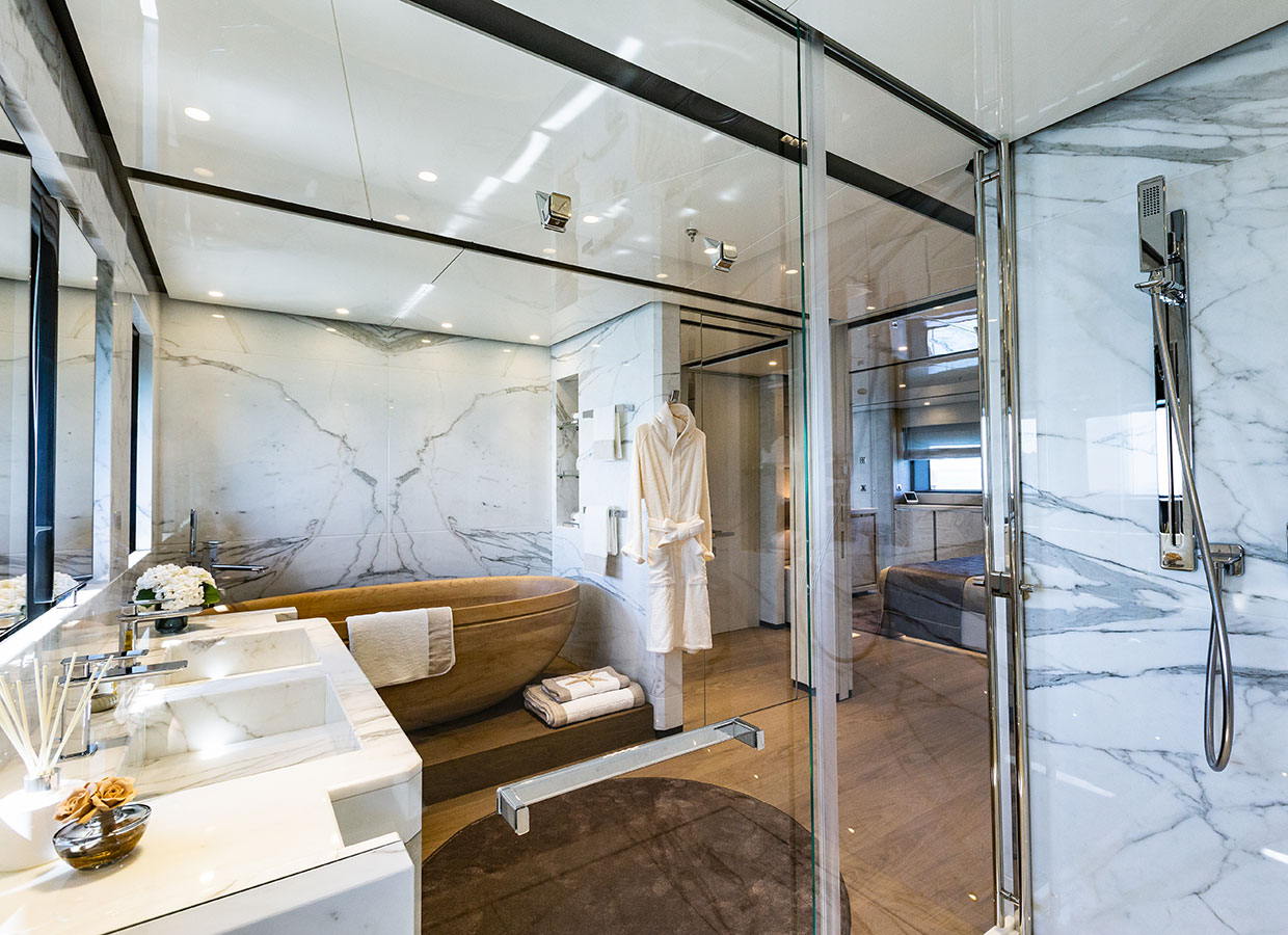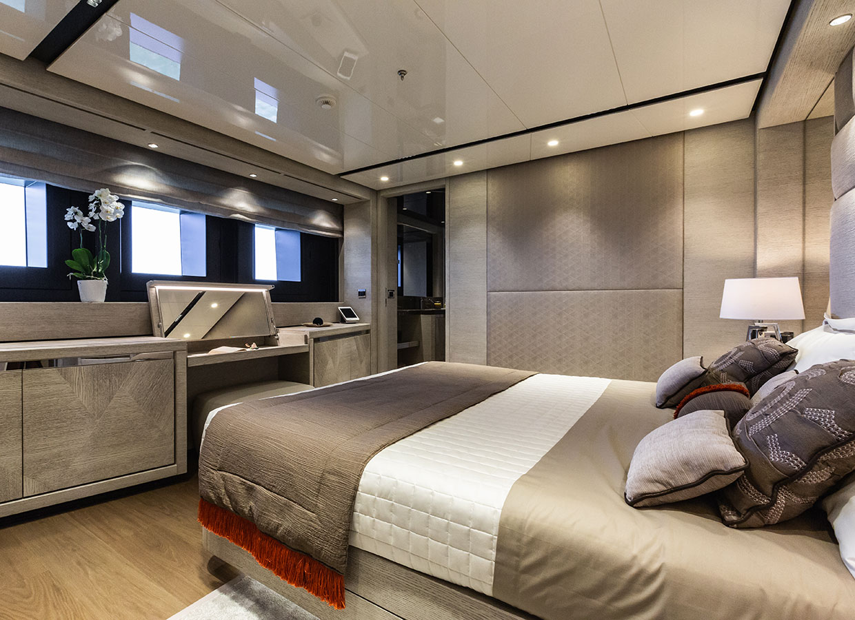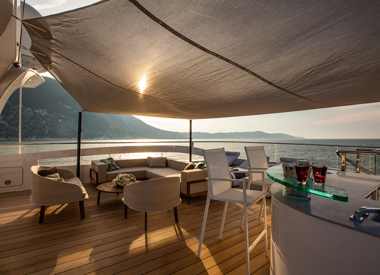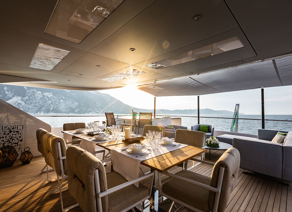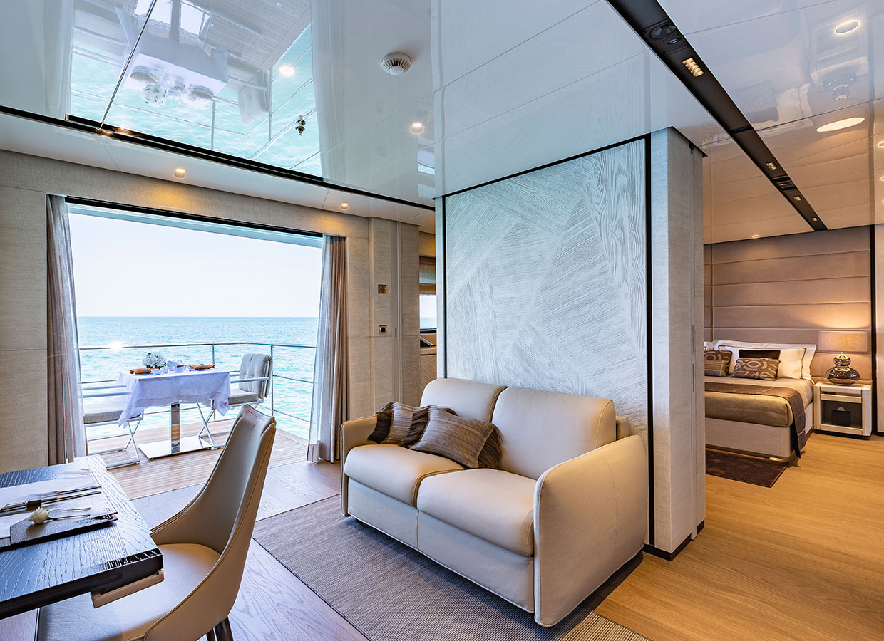 One of the most exceptional features on board can be found in the area reserved for the owner: an apartment that extends across the complete beam of the yacht with two private balconies overlooking the sea.