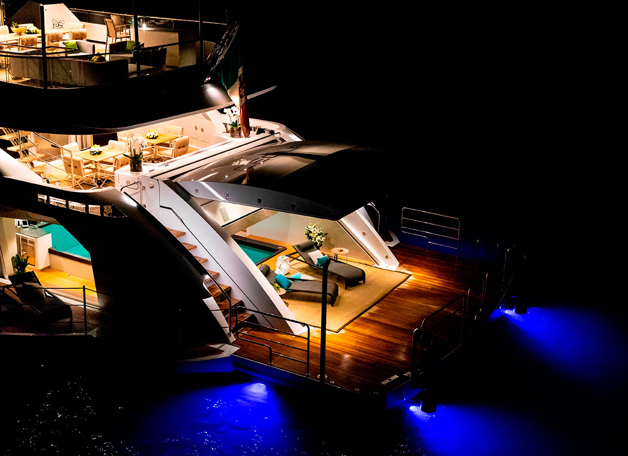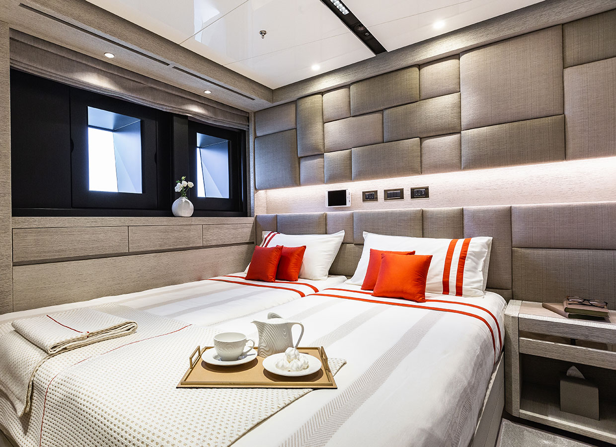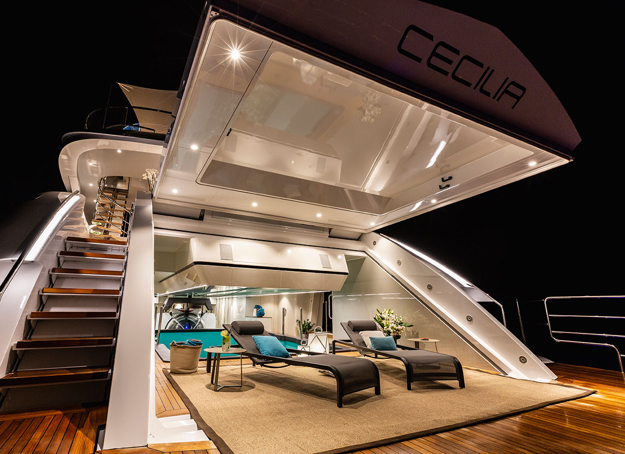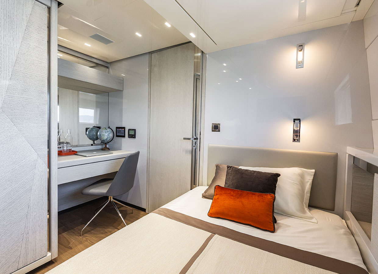 One of the most exceptional features on board can be found in the area reserved for the owner: an apartment that extends across the complete beam of the yacht with two private balconies overlooking the sea.