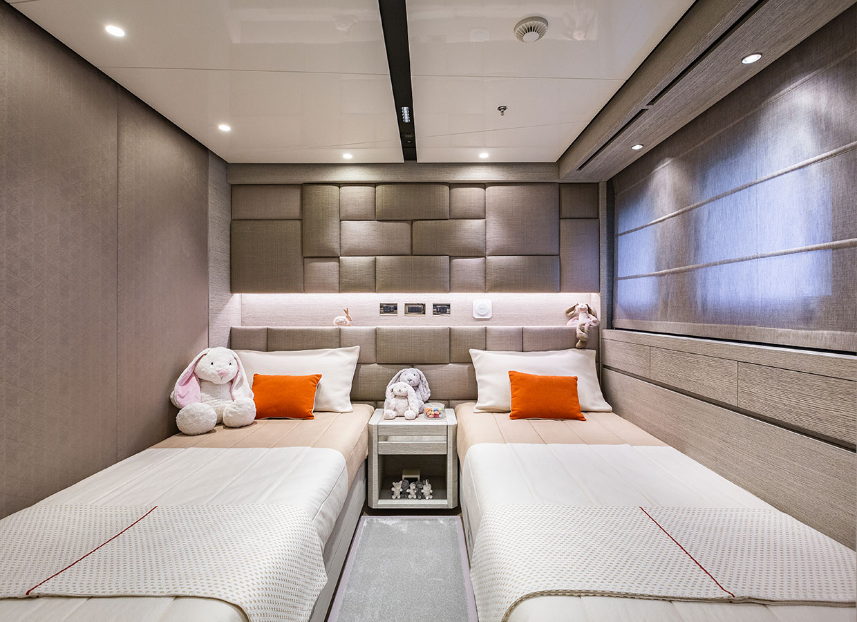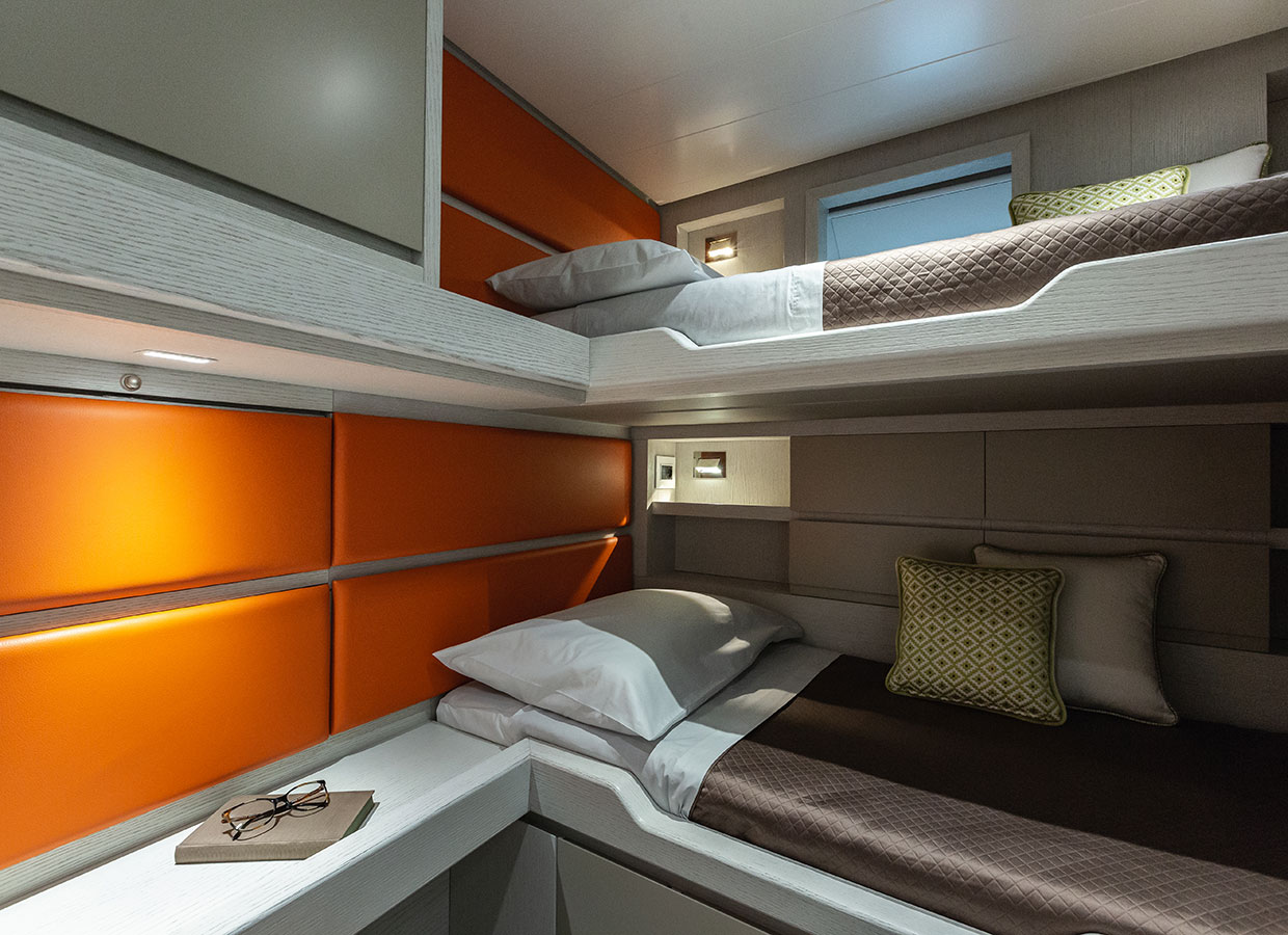 - 11 crew total, accommodated in 5 crew cabins + Captain’s cabin