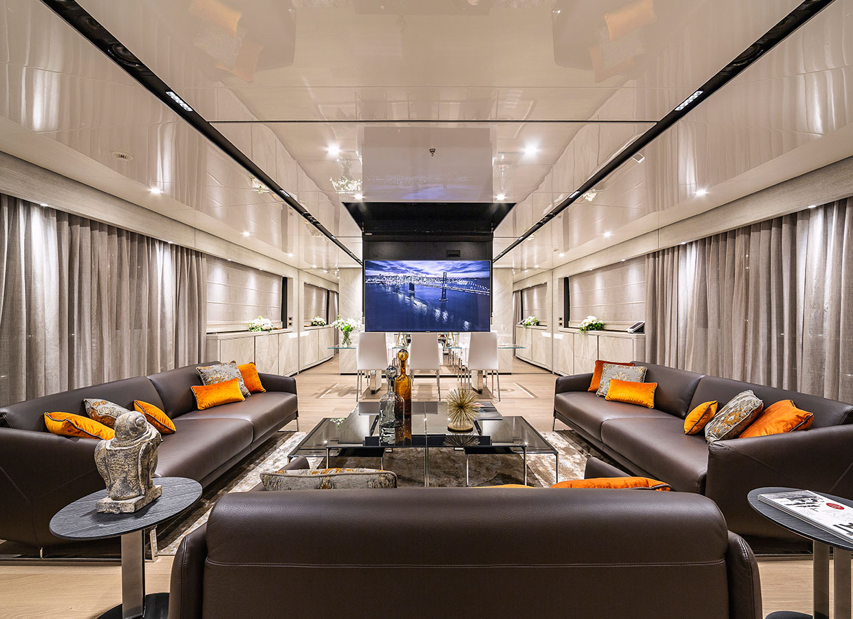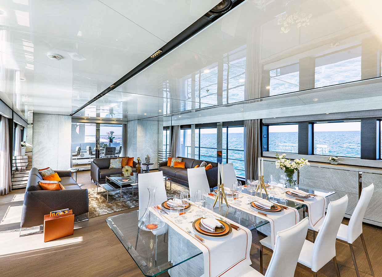 Wide floor-to-ceiling windows envelop the lounges of the main deck, allowing natural light to pleasantly illuminate the spacious living areas and allow magnificent views of the yacht’s surroundings.