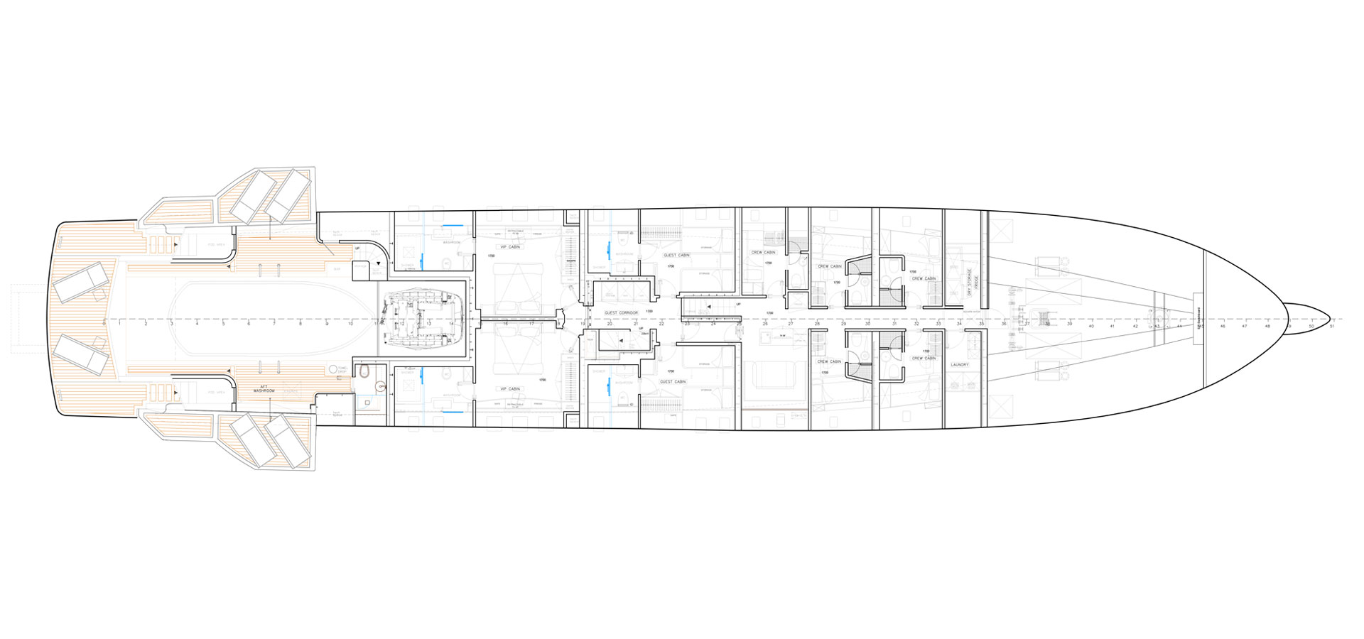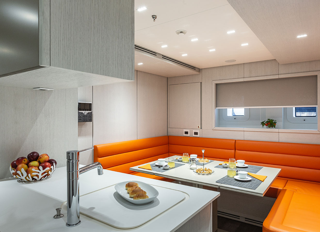 A large cabin on the upper deck adjacent to the wheelhouse is reserved for the captain. Crew members have four twin cabins in the lower deck, along with the wide crew mess. These cabins are on either side of a central corridor with direct access to the engine room in the bow and away from guest cabins. Accommodation meets the latest LY3 standards.