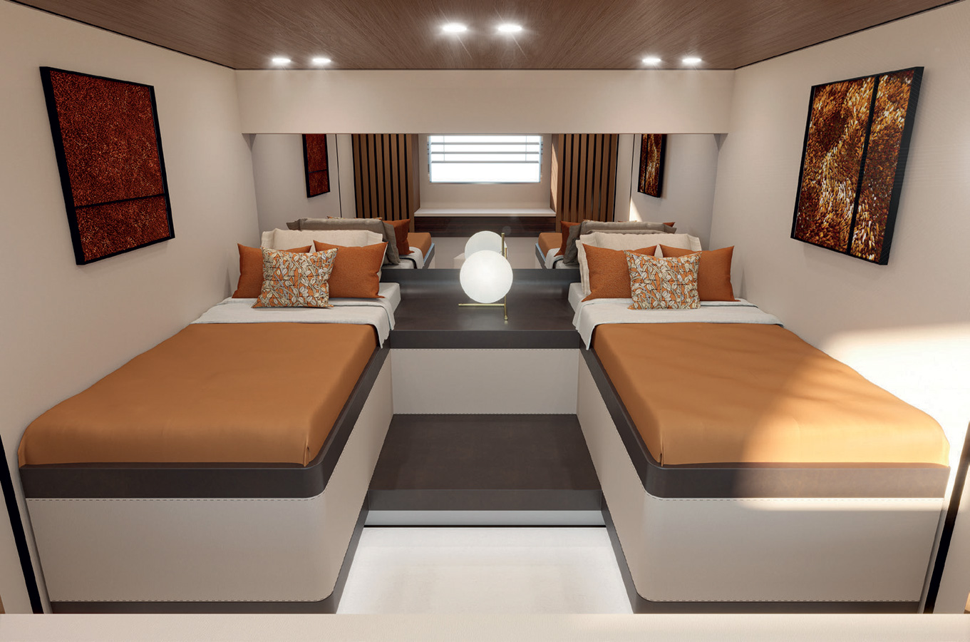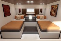 The standard below deck layout provides two ultra-generous VIP cabins that uniquely offer two platforms opening directly onto the beach club. In addition, there is an en-suite double Guest cabin.