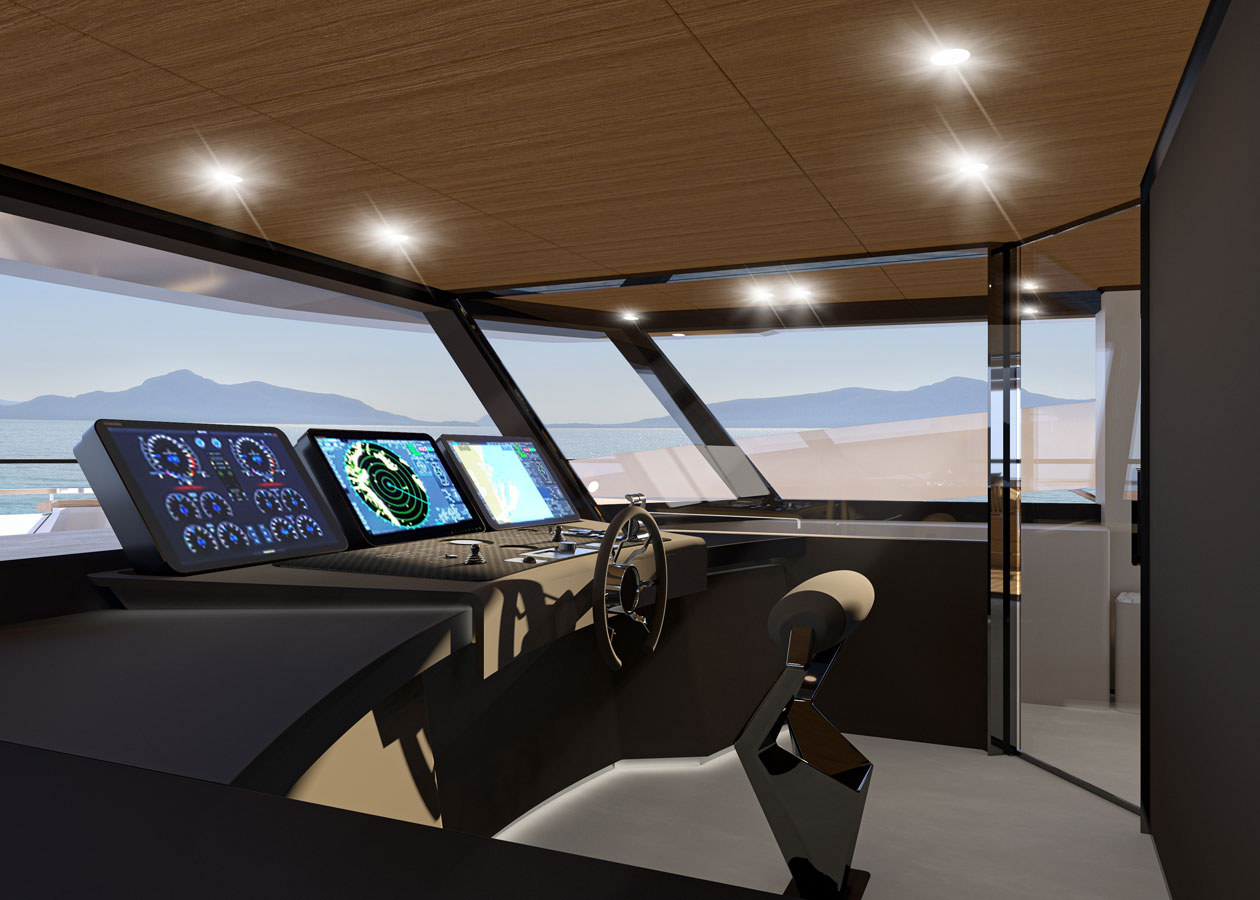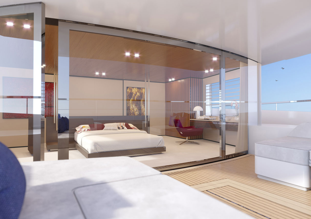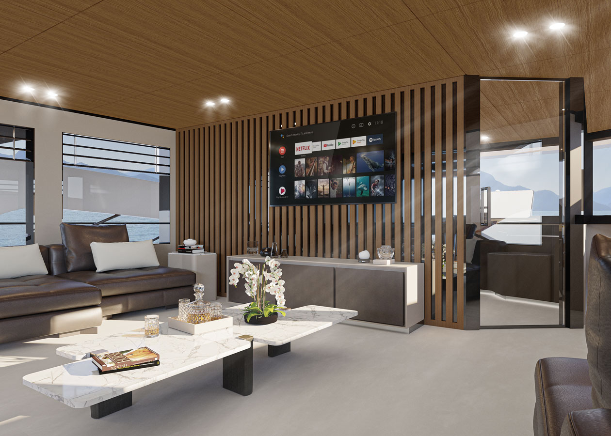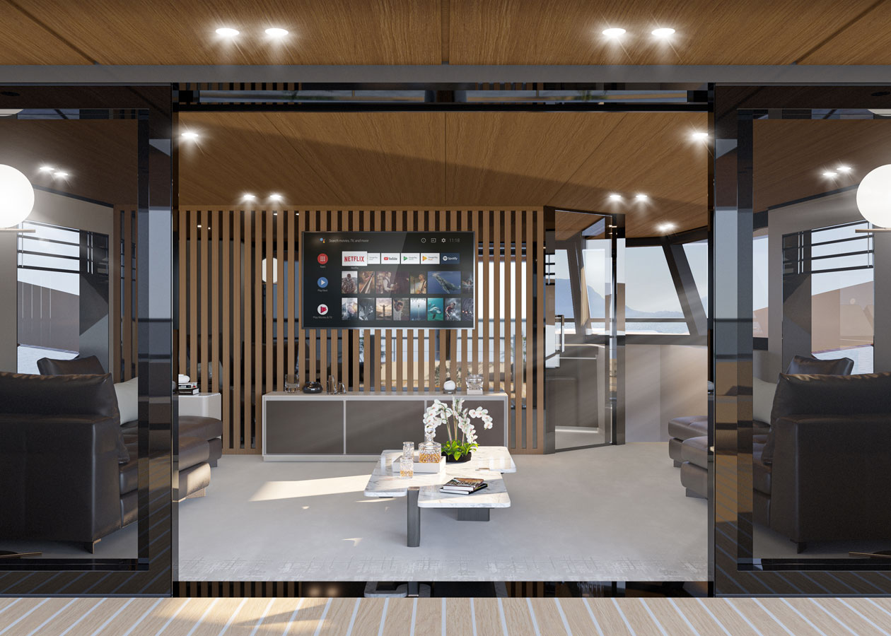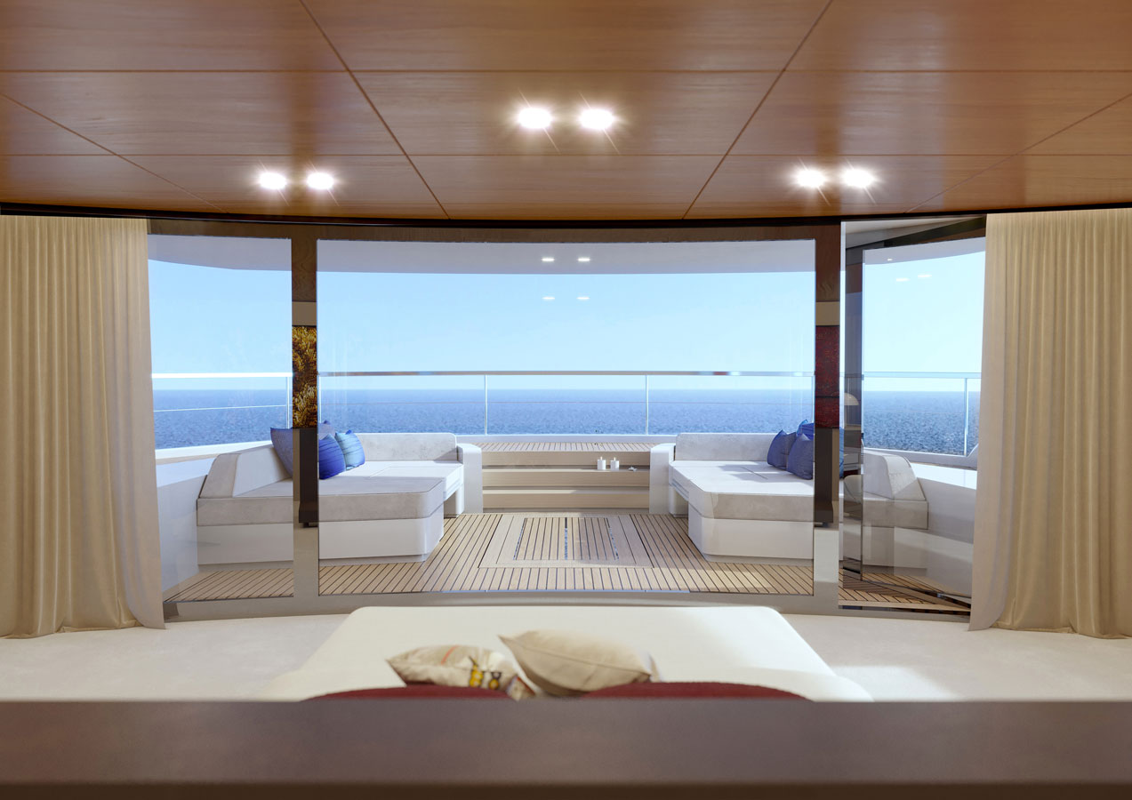 Large windows, full contact with the sea, versatility and privacy are just a few of the main features. The aft main deck offers a stunning 360-degree view thanks to the uninterrupted windows and flush doors surrounding the guests.