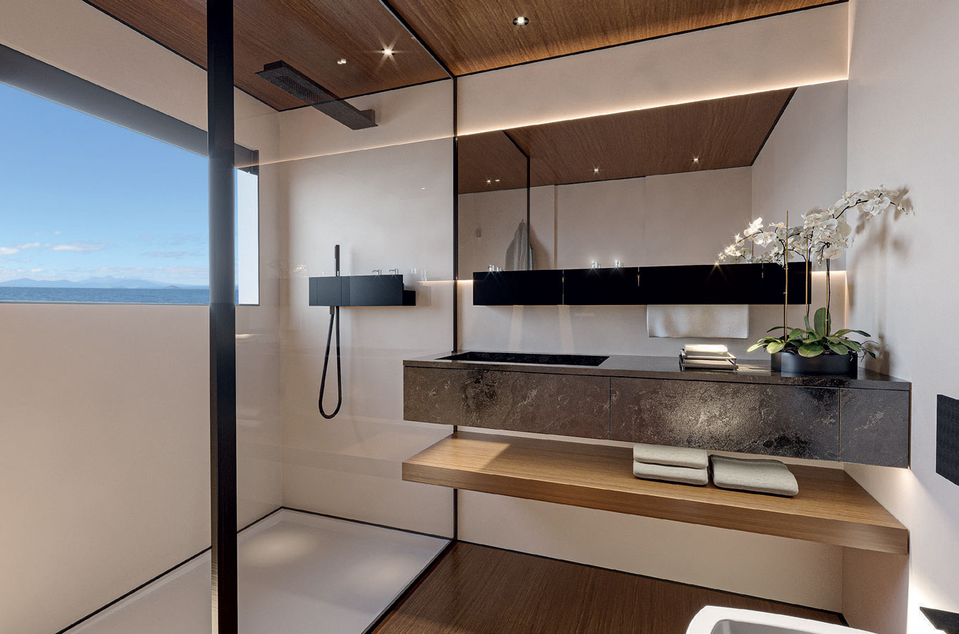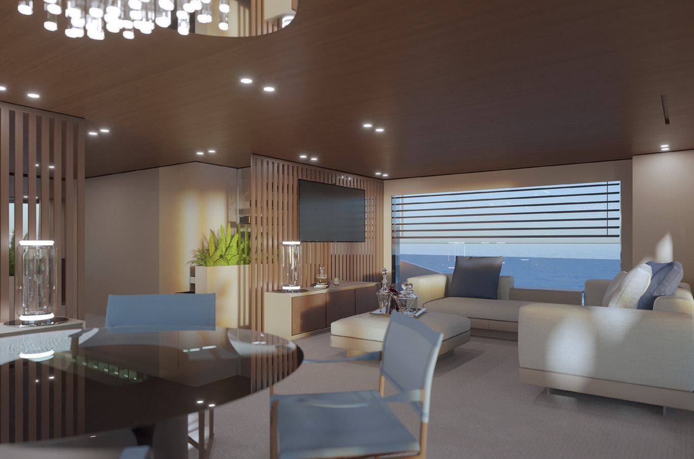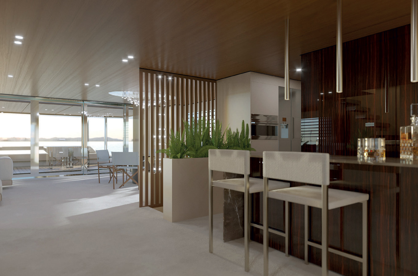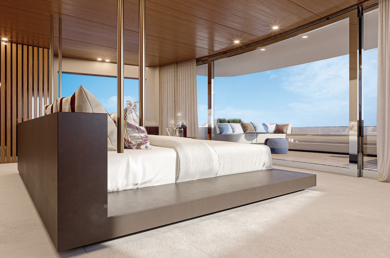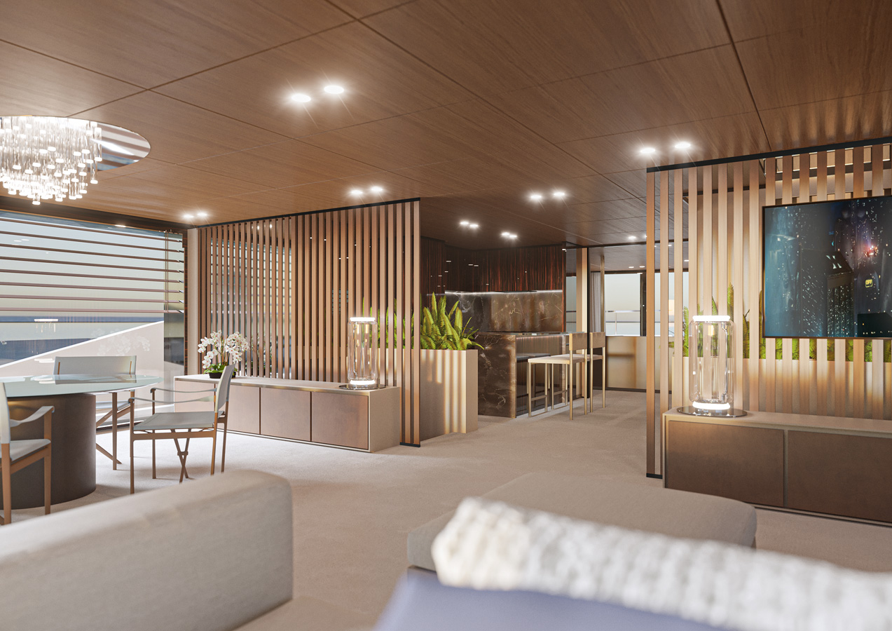Large windows, full contact with the sea, versatility and privacy are just a few of the main features. The aft main deck offers a stunning 360-degree view thanks to the uninterrupted windows and flush doors surrounding the guests.