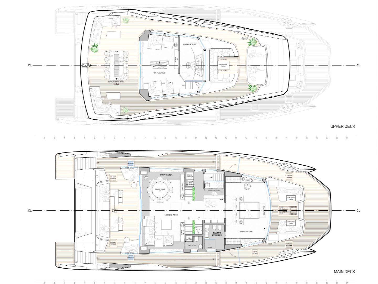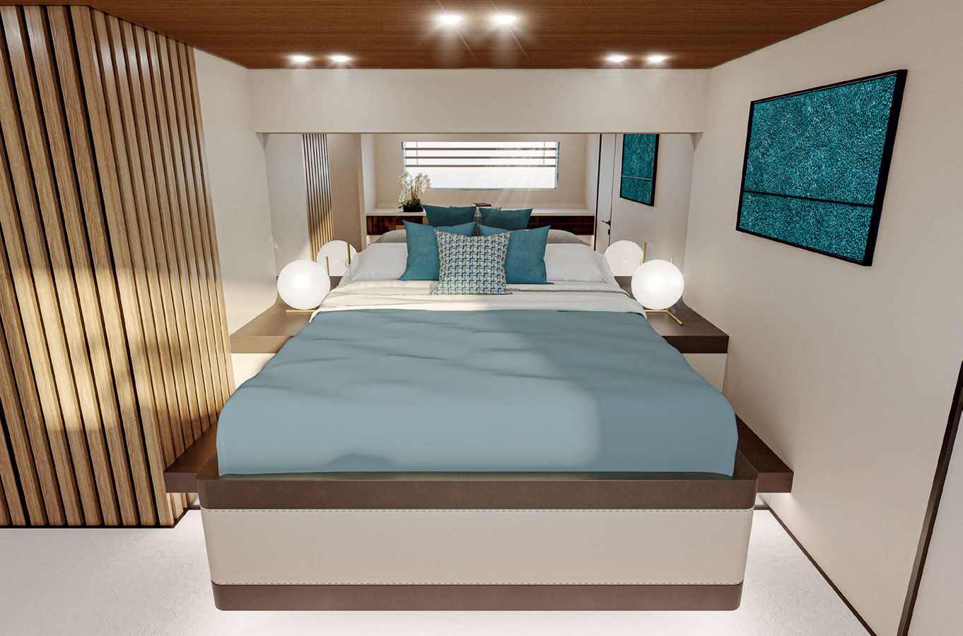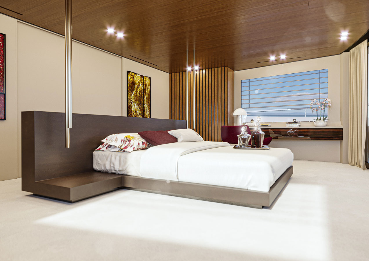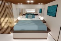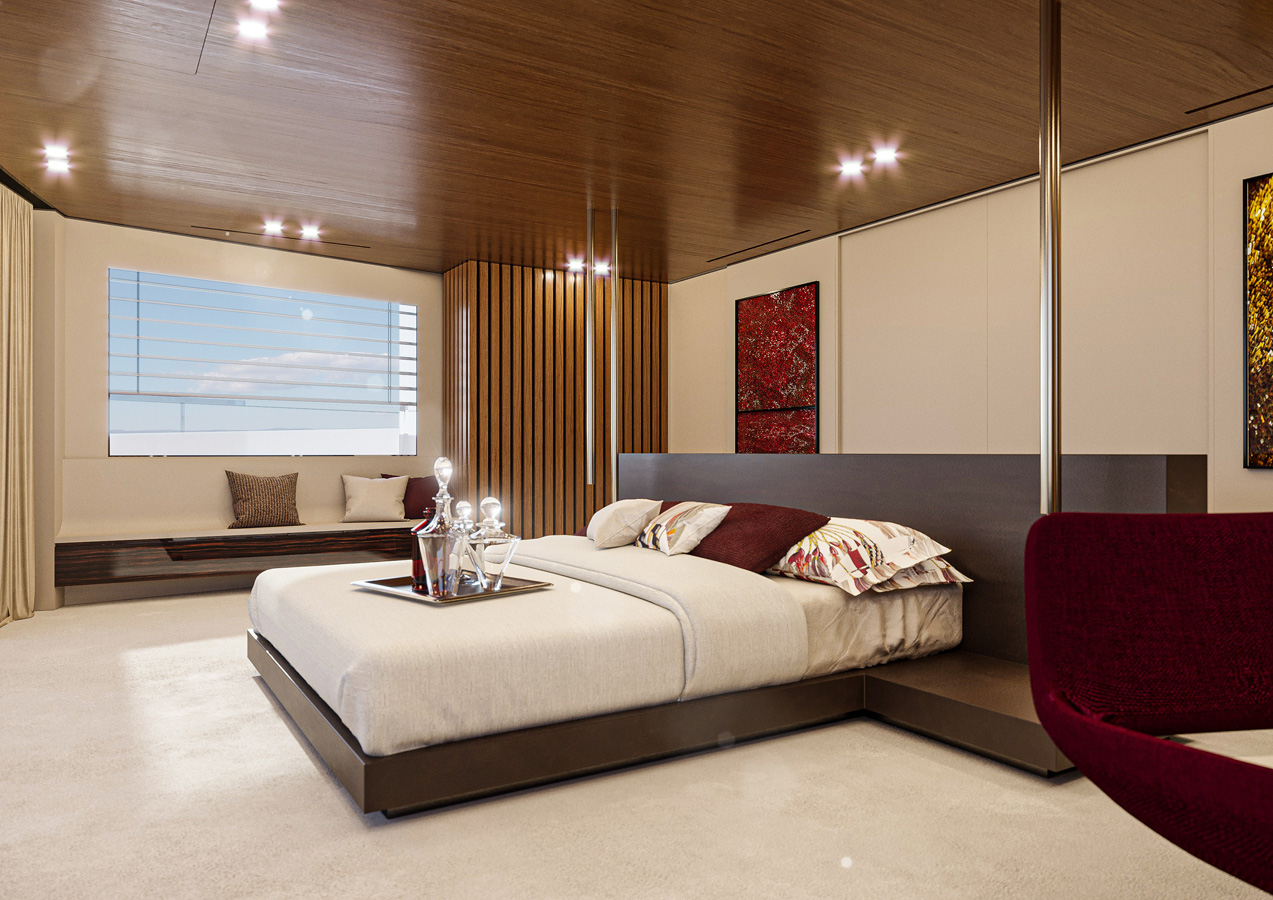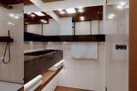 The lower deck also provides a generous and usable crew area at the bow. Naturally, the shipyard gives owners the option of a 4-cabin layout lower-deck. The main deck covers an area of more than 100 m2 and nearly half of it is the master stateroom alone, with a breadth comparable to a wide body.